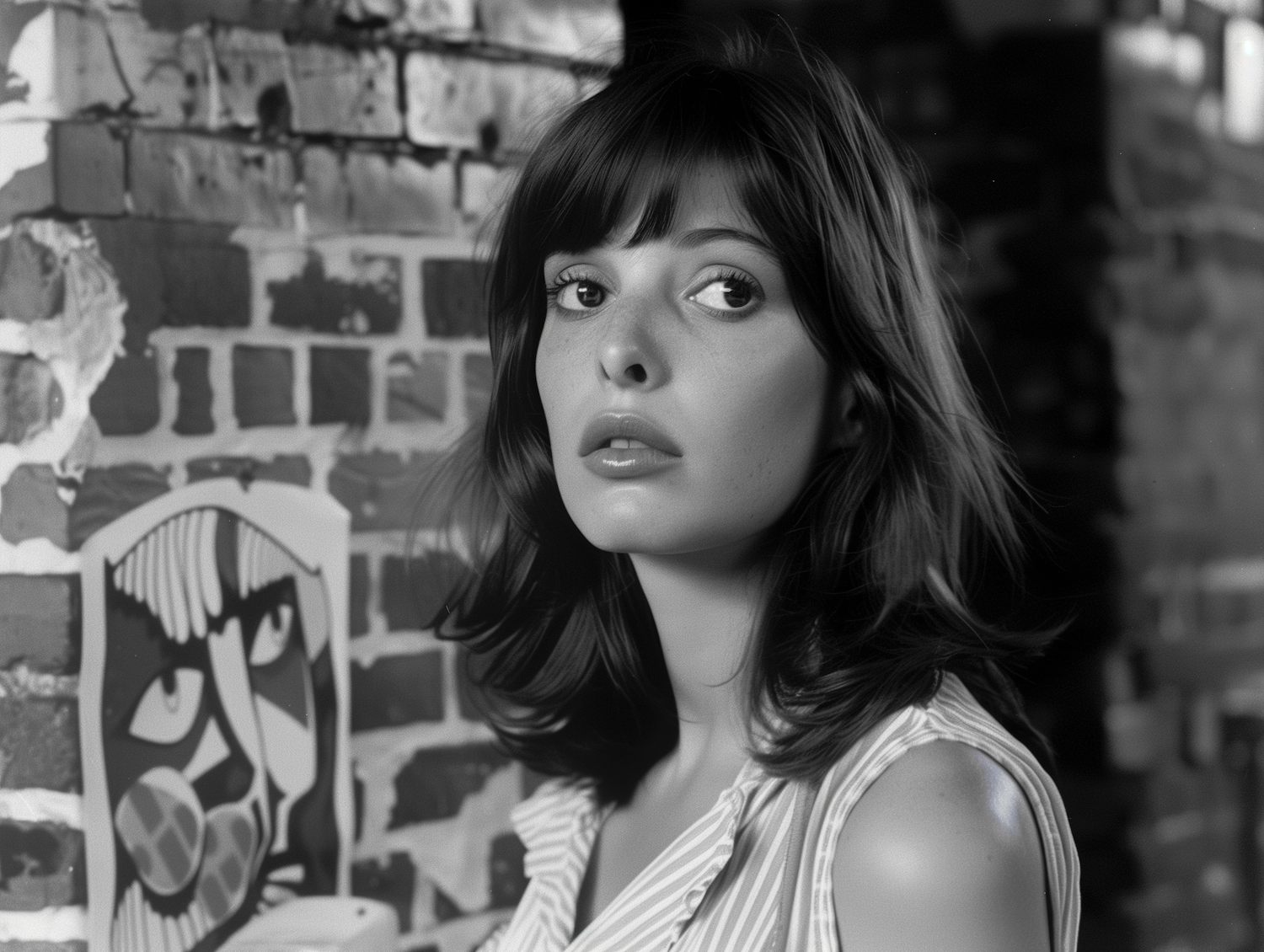 Young woman with dark hair and striped top stands by a brick wall with abstract art, creating a stylish and artistic scene.