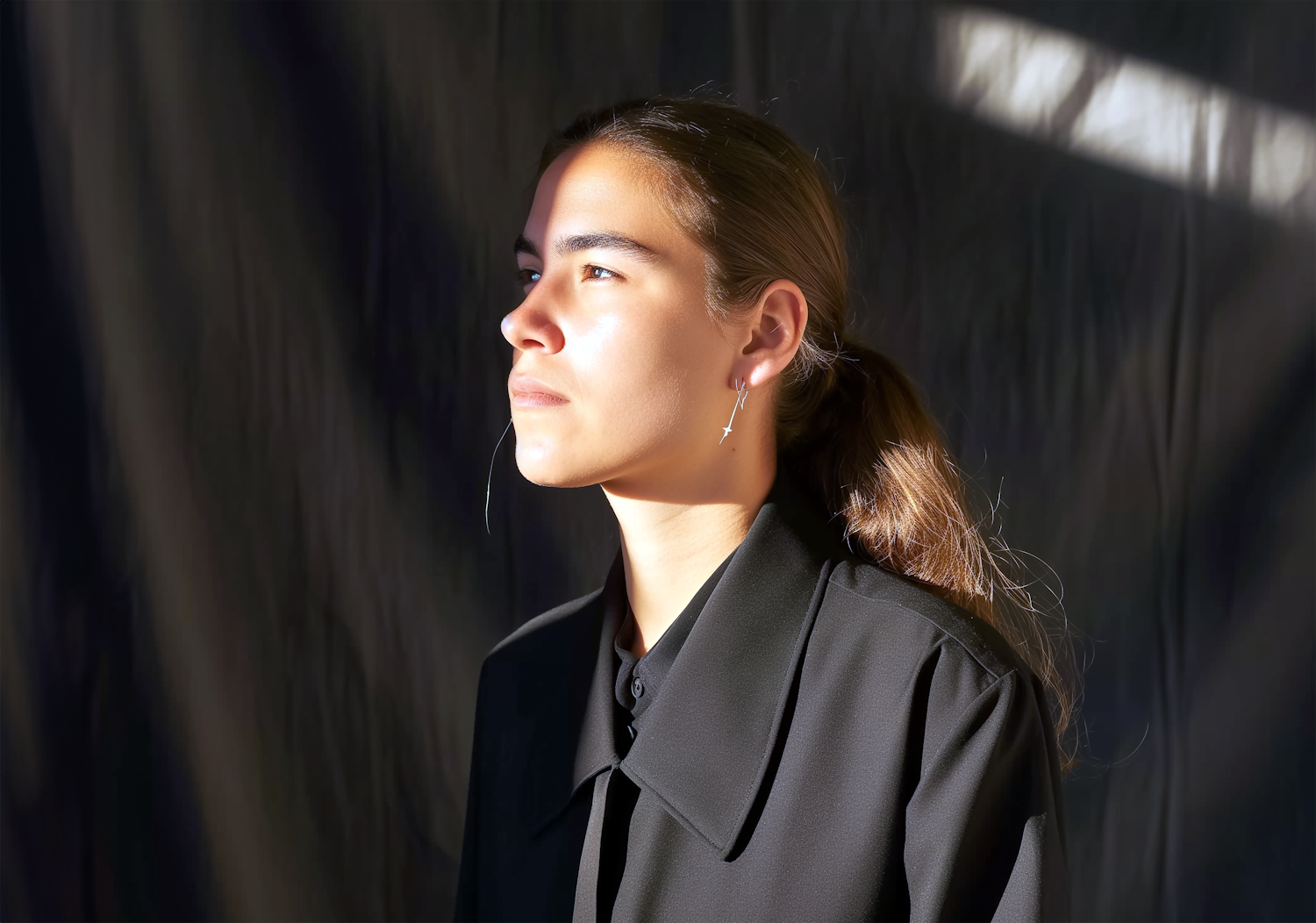 Young woman in black coat with ponytail and earrings, gazing thoughtfully against a dark background, illuminated by soft light.