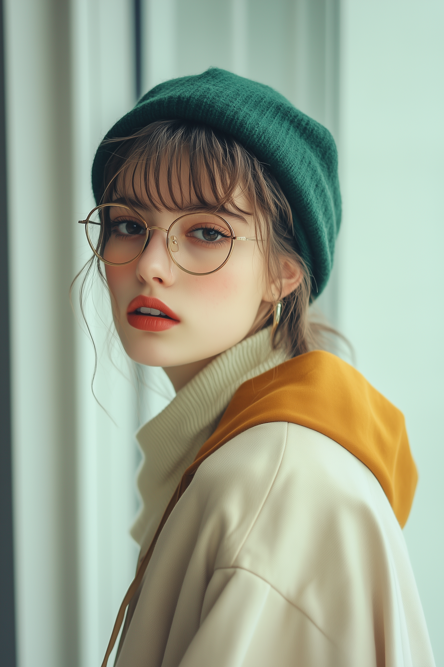 Stylish woman with green beret and glasses, wearing a mustard jacket and cream turtleneck. Modern, chic look with soft makeup.