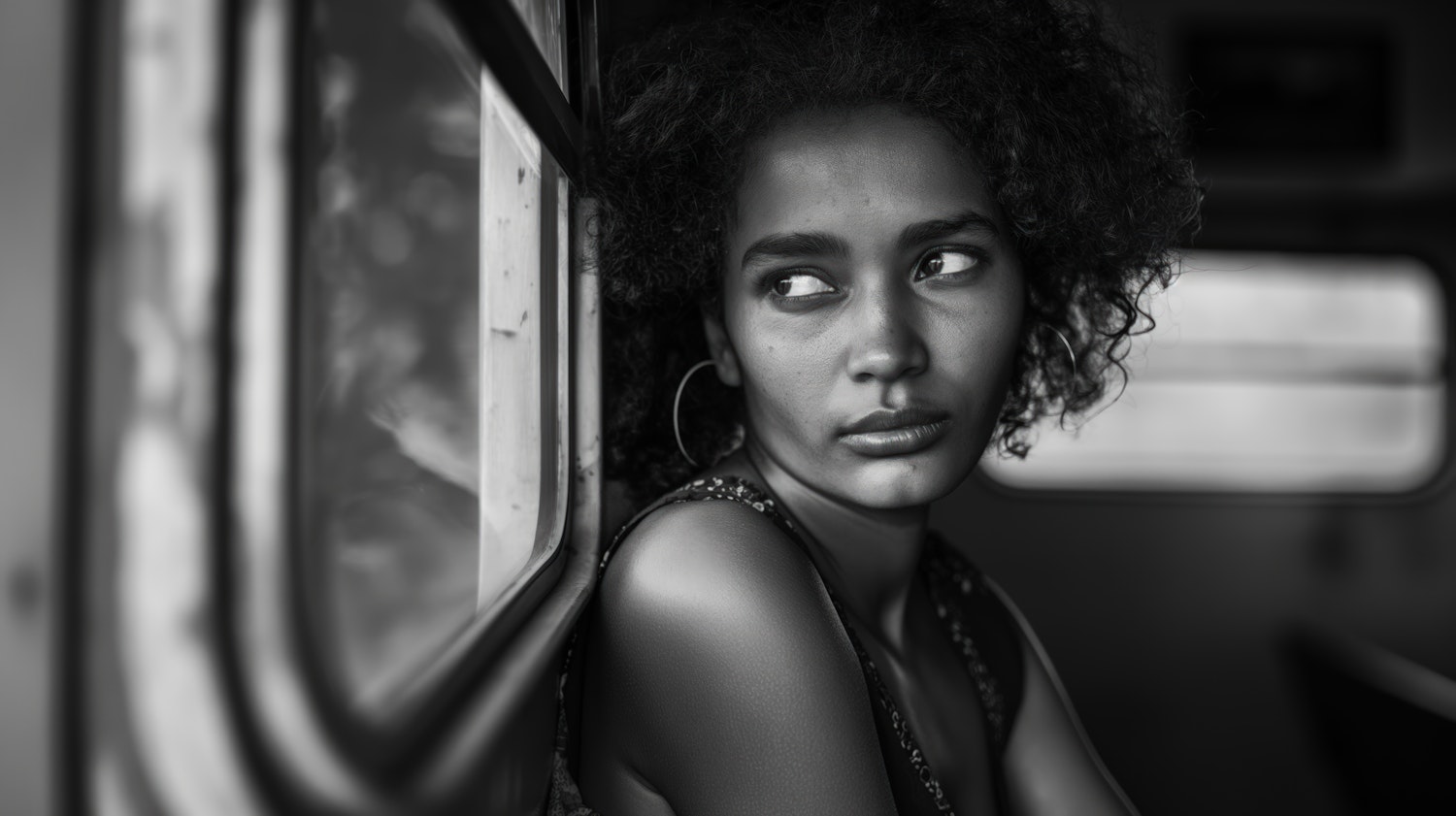 Black and white portrait of a contemplative woman with curly hair, gazing out a window. Soft lighting highlights her thoughtful expression.