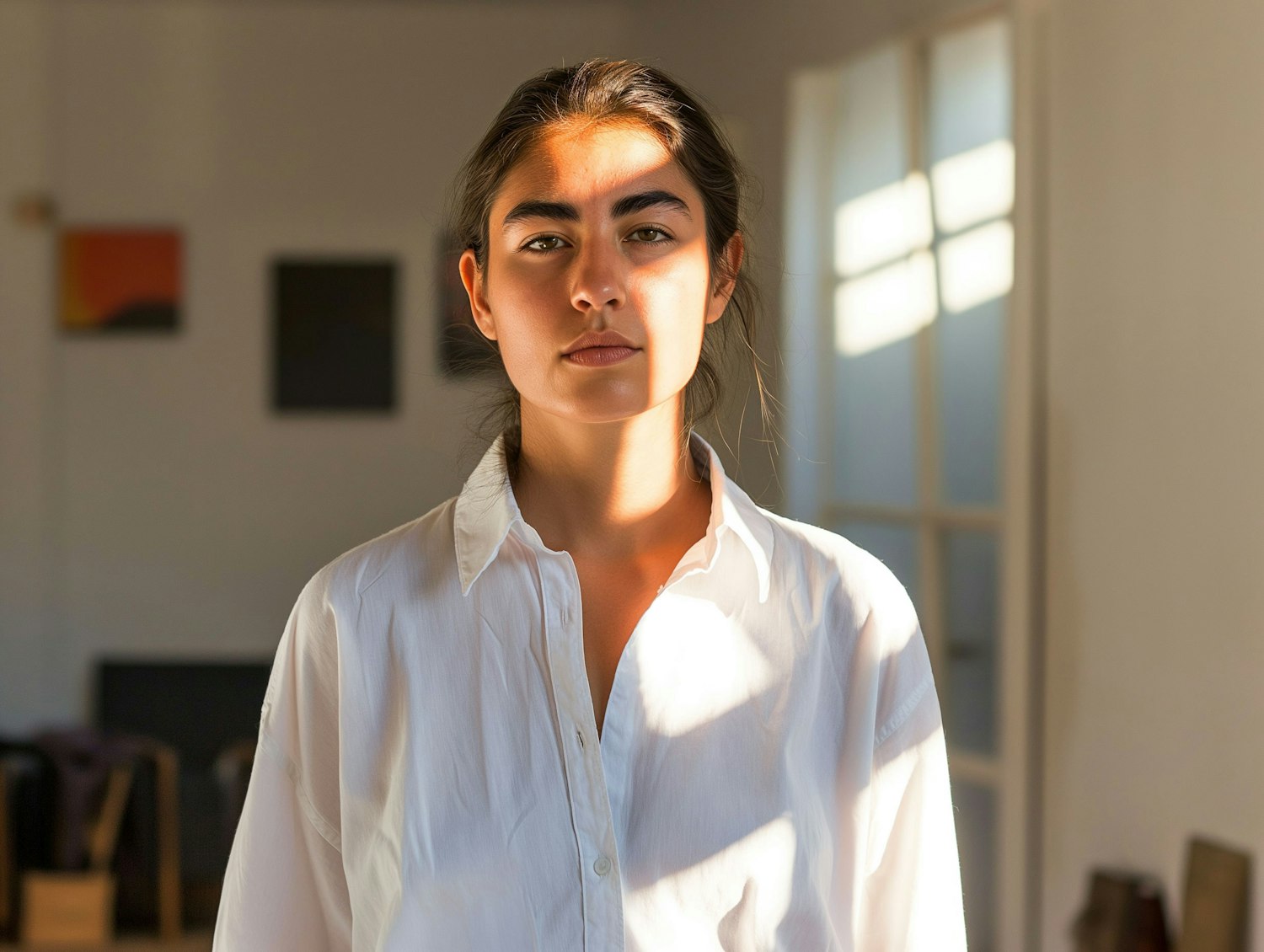 Young woman in a white shirt stands in a sunlit room with abstract art on the walls, casting soft shadows.