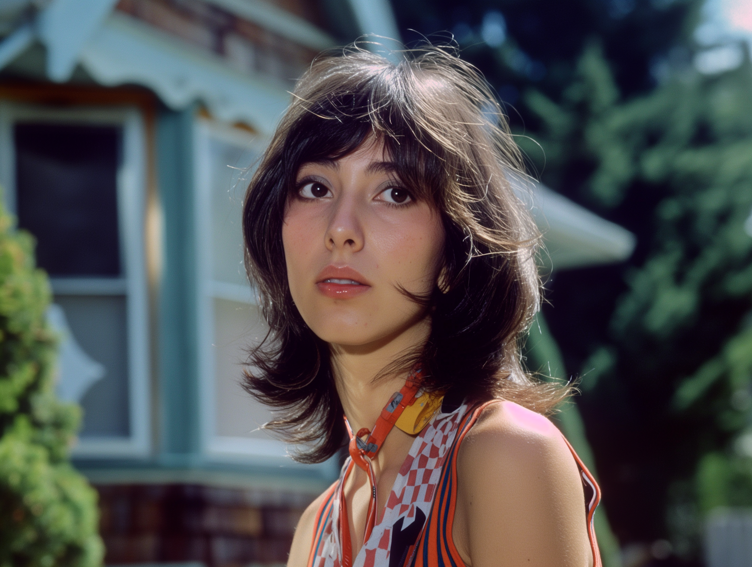 Young woman with layered dark hair and colorful top, standing outdoors with a house in the background.