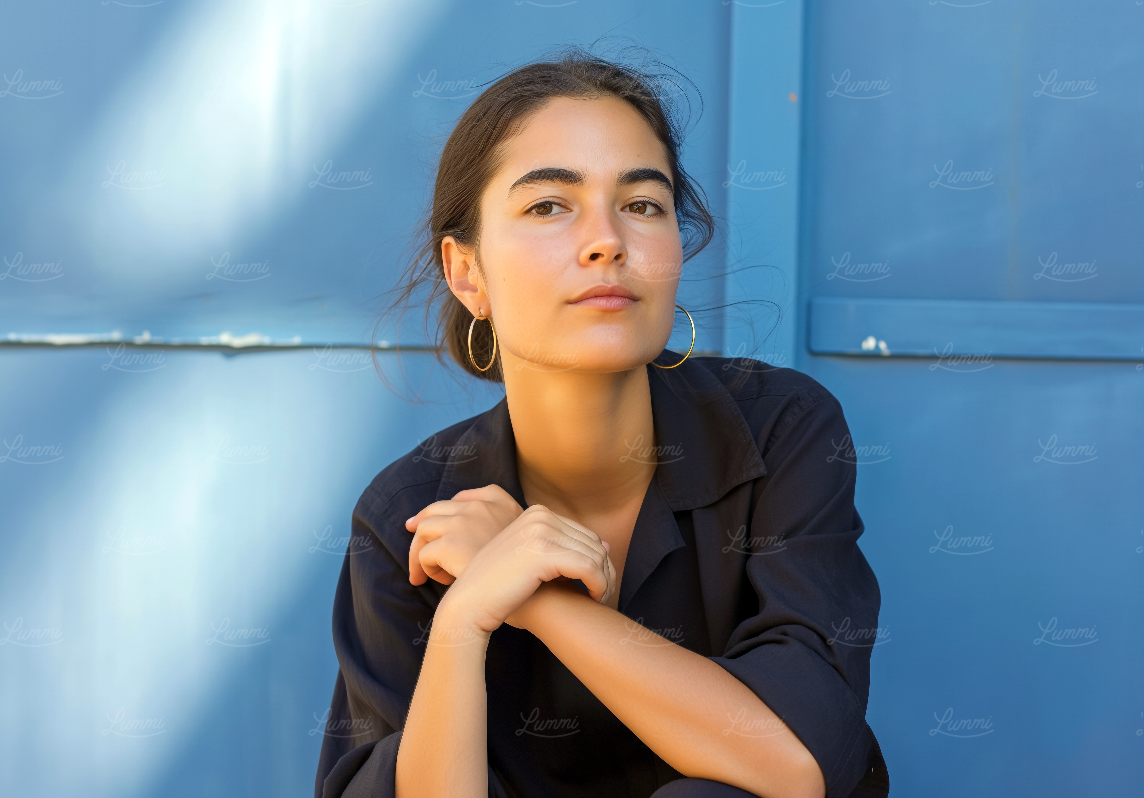Young woman with hoop earrings against a vibrant blue background, exuding calm confidence. Dark hair, olive skin, and a navy shirt.