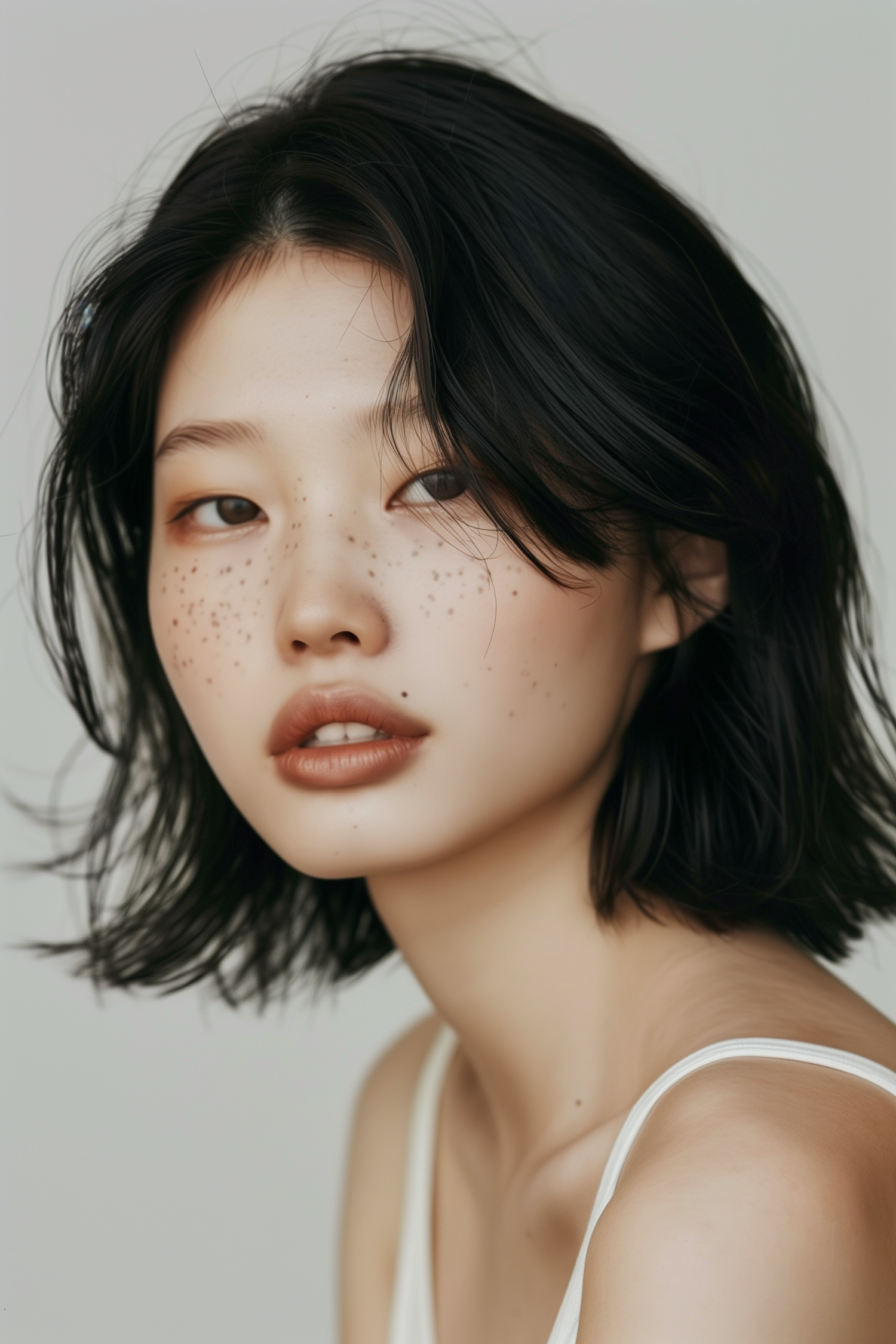Portrait of a young Asian woman with dark hair, freckles, and a serene expression, wearing a white tank top.