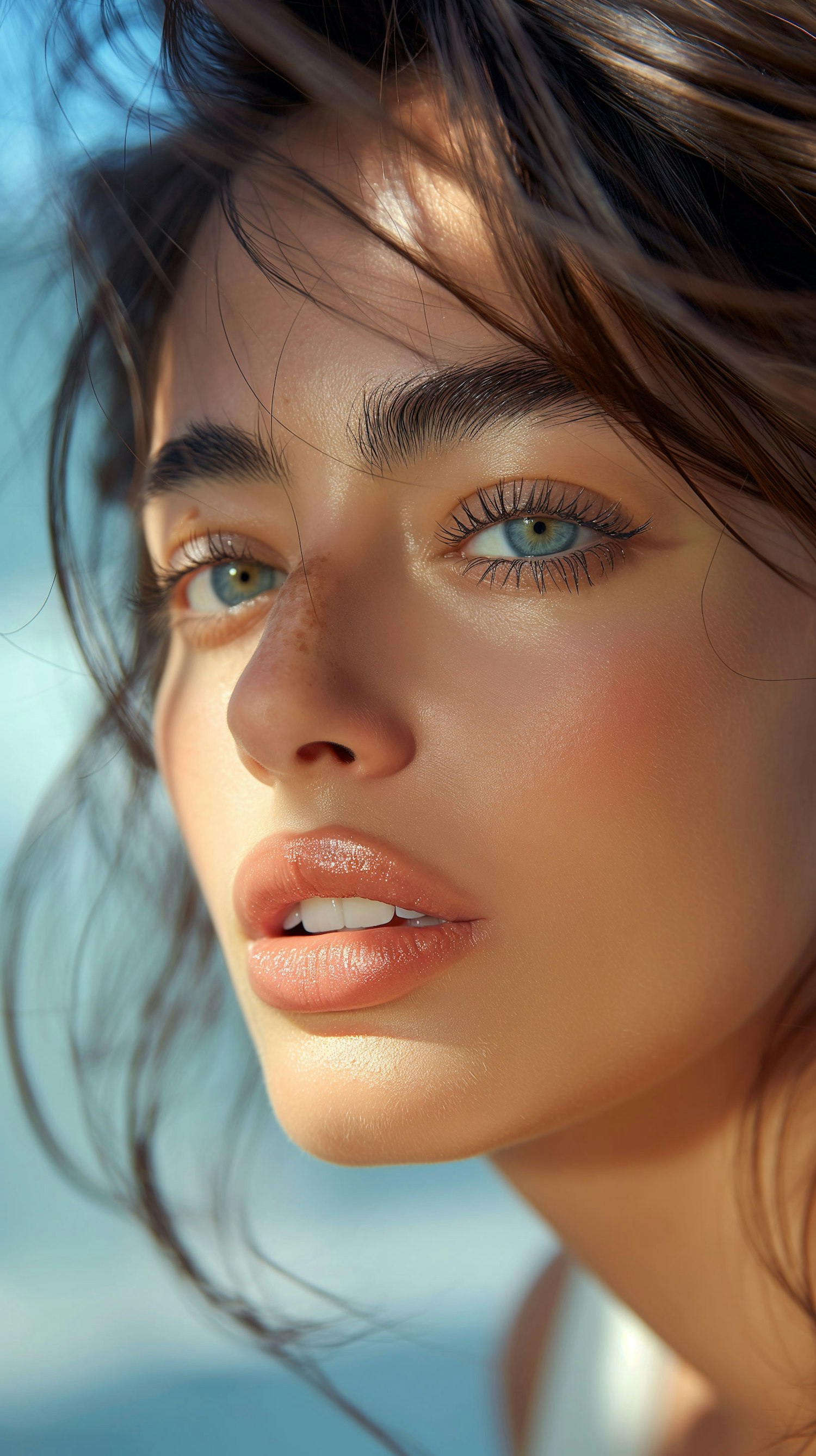 Close-up portrait of a woman with blue eyes and dark hair, bathed in sunlight, with a serene expression and natural beauty.