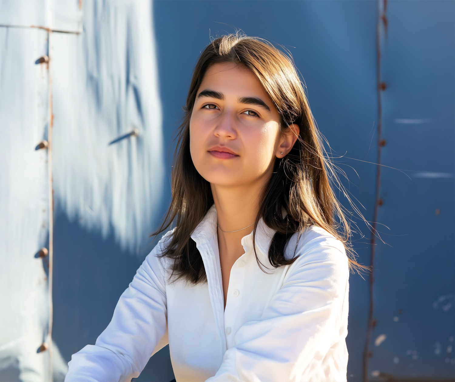 Young woman with dark brown hair and white shirt against a blue background, exuding calm confidence in natural light.