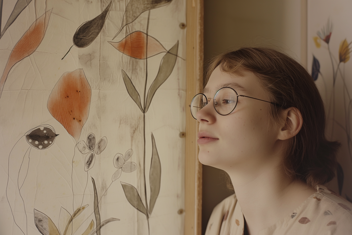 Young woman with glasses admires abstract botanical art in muted tones, creating a serene and contemplative atmosphere.
