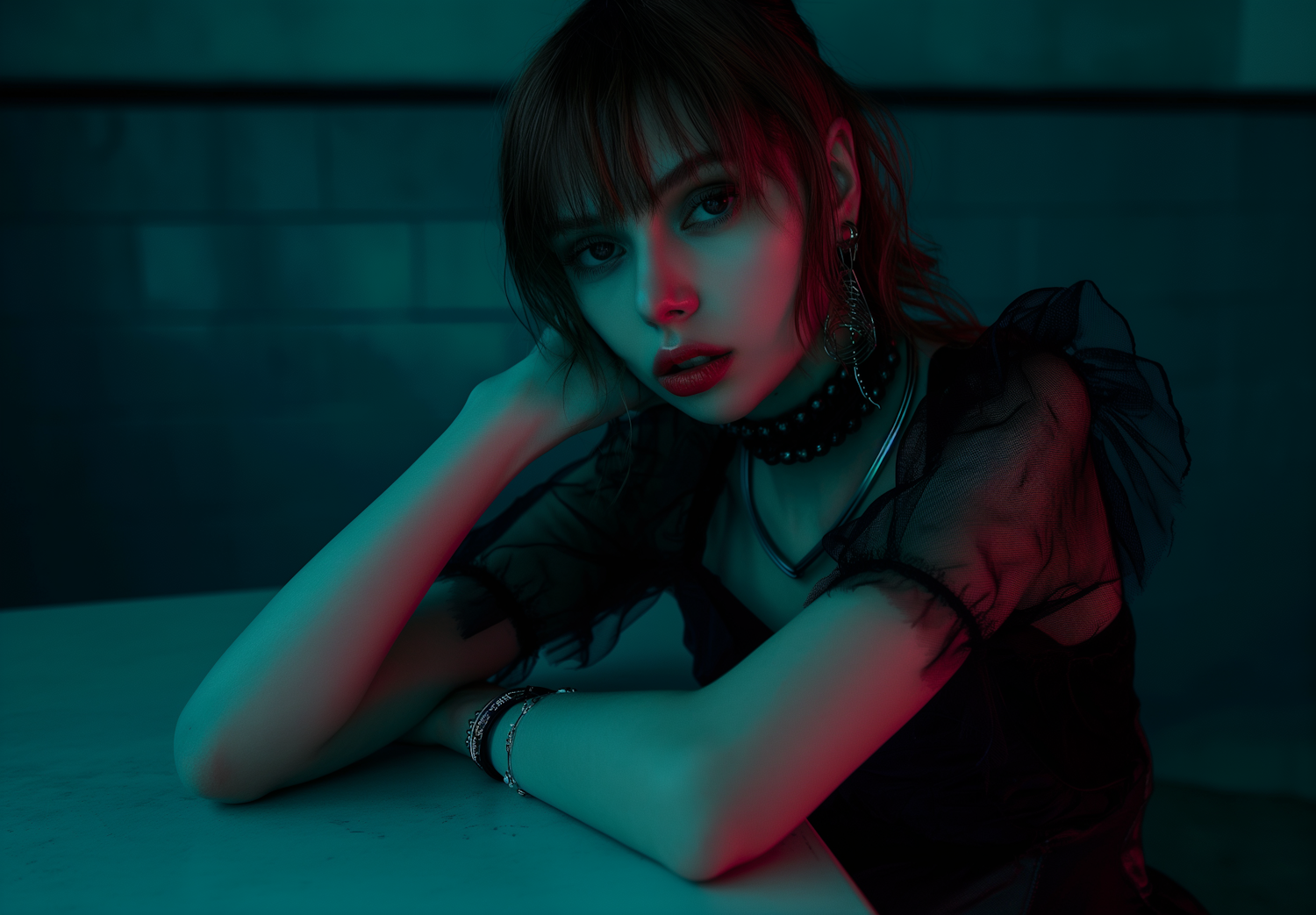 Moody portrait of a young woman with auburn hair, wearing a black top and choker, in dramatic teal and red lighting.