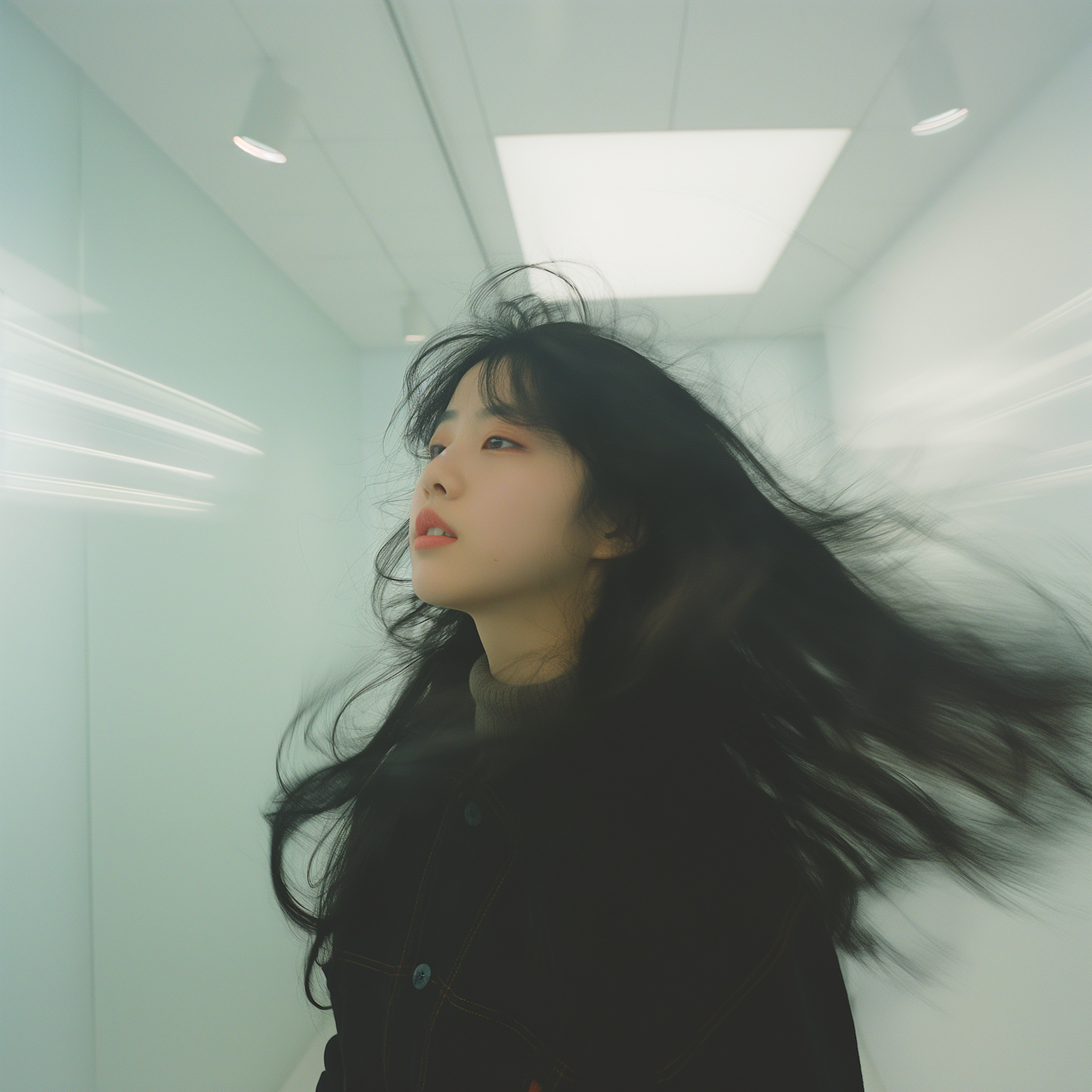 Dynamic portrait of a young woman with flowing black hair in a modern hallway, featuring motion blur and a minimalist aesthetic.