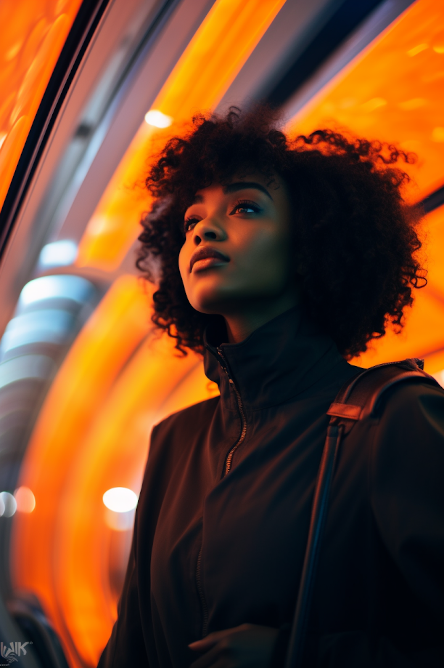 A young woman with curly hair gazes upward, surrounded by vibrant orange and yellow lights, creating a futuristic ambiance.