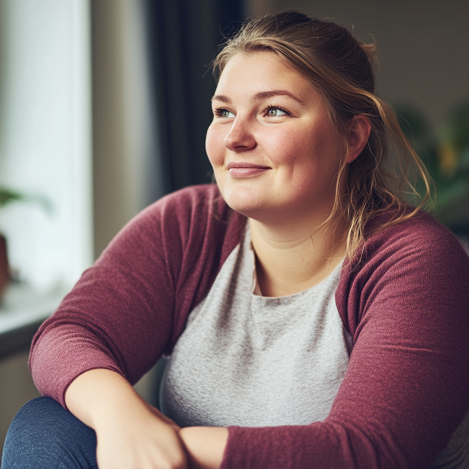 Caucasian woman with light brown hair, wearing a maroon cardigan, gazes thoughtfully out a window, exuding a relaxed and content vibe.