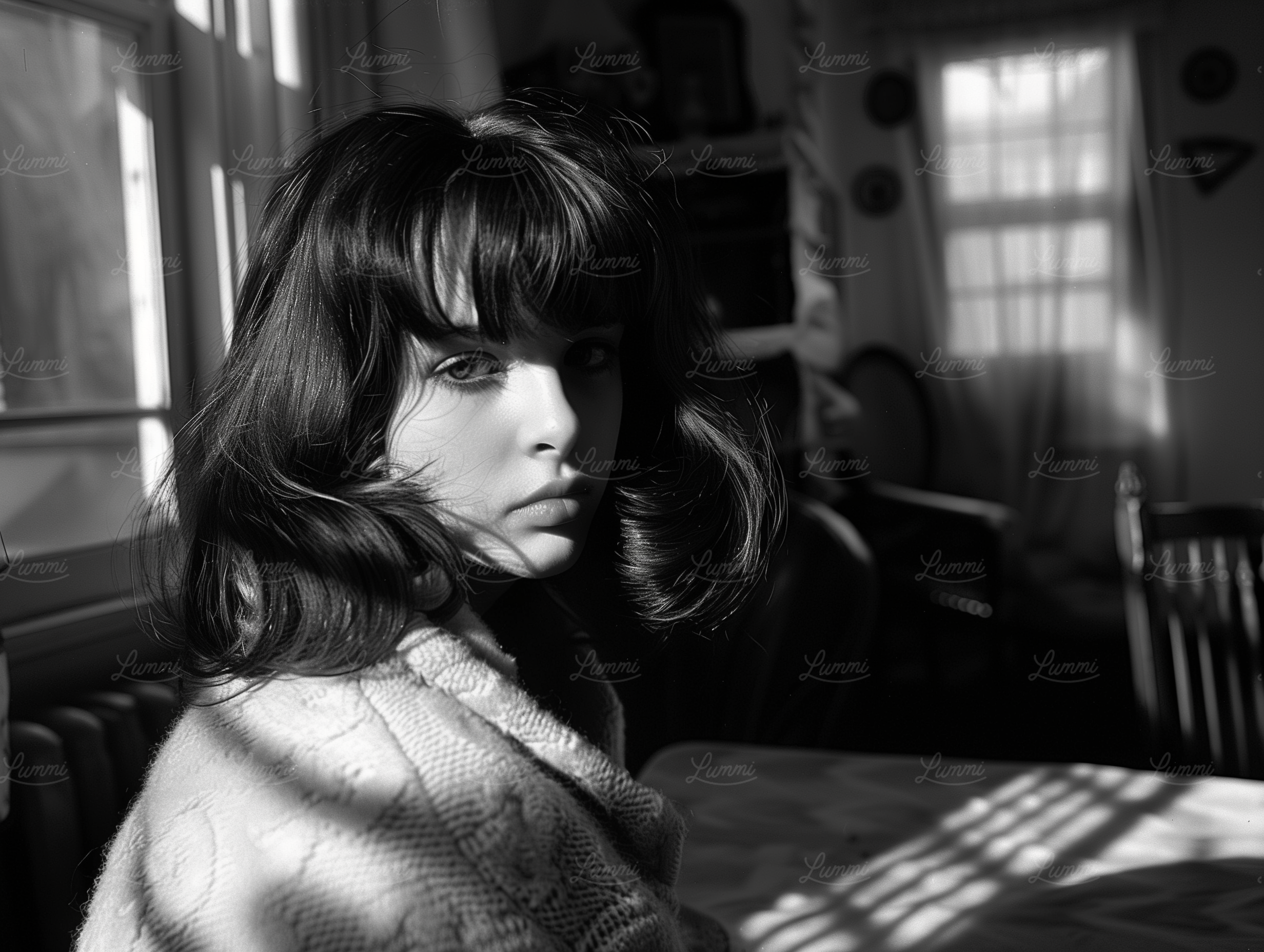 A young woman with dark hair and fair skin sits in a sunlit room, wrapped in a blanket, gazing thoughtfully at the camera.