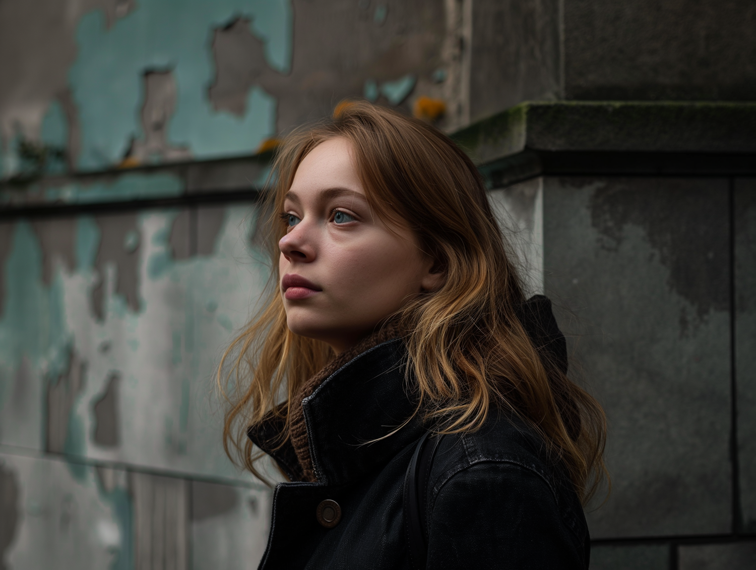 Young woman in a dark coat stands against a peeling wall, gazing contemplatively. Urban, moody atmosphere with soft lighting.