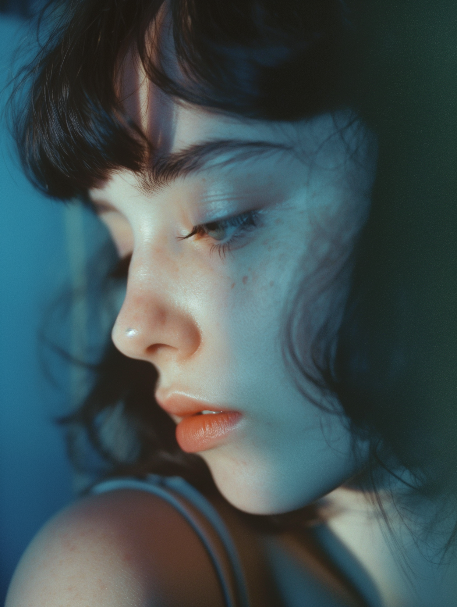 Close-up of a young woman with dark hair, fair skin, and freckles, in moody blue lighting, gazing downward with a serene expression.