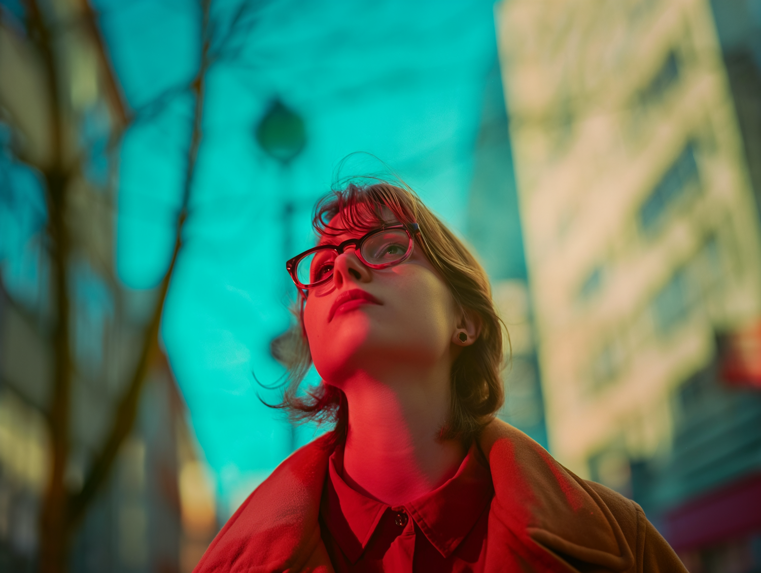 Young woman with glasses in a cityscape, dramatic red and blue lighting, thoughtful expression, urban background.