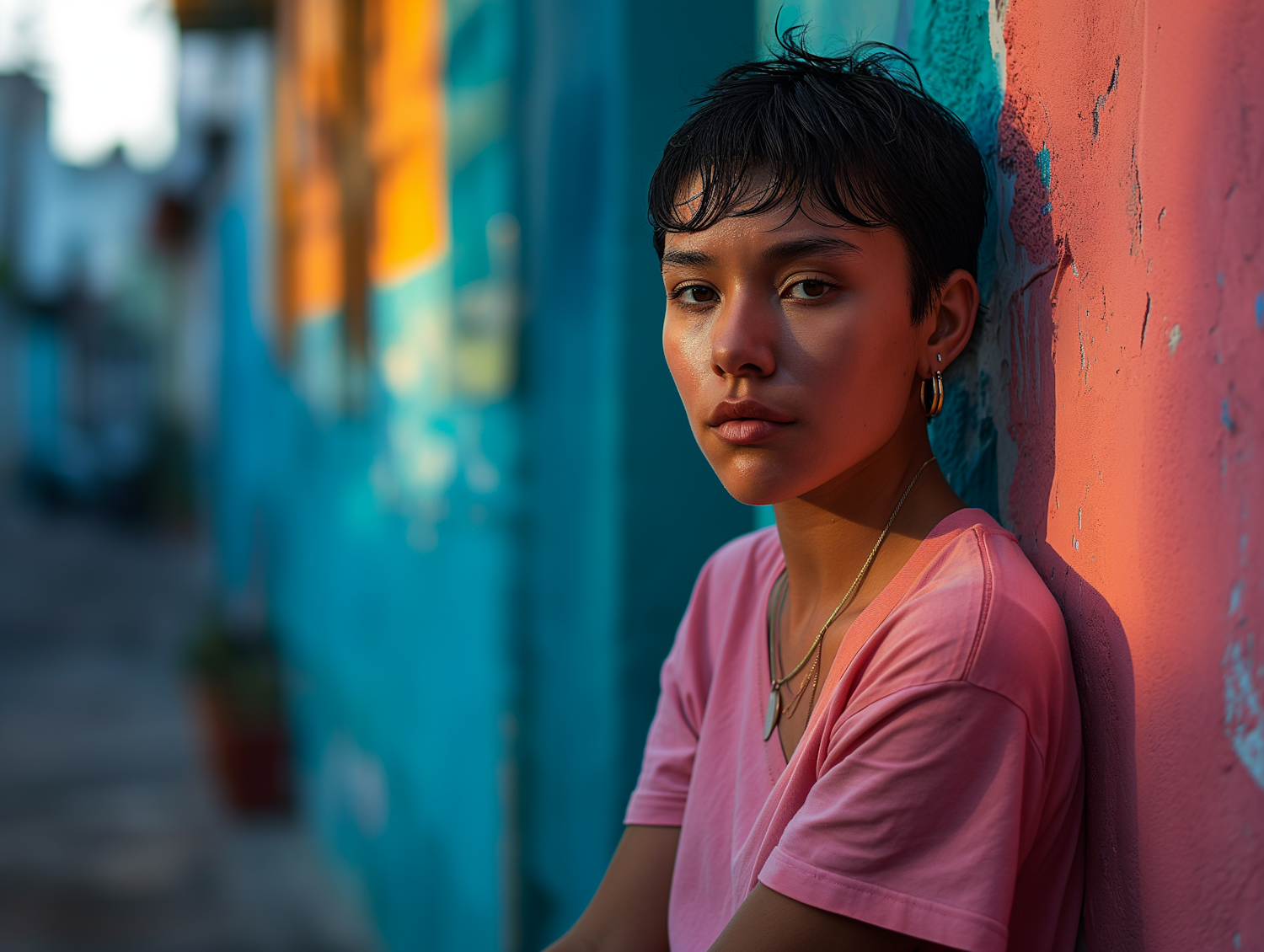 Young person with short hair leans against a pink wall, wearing a pink shirt and gold earrings, in a colorful urban setting.