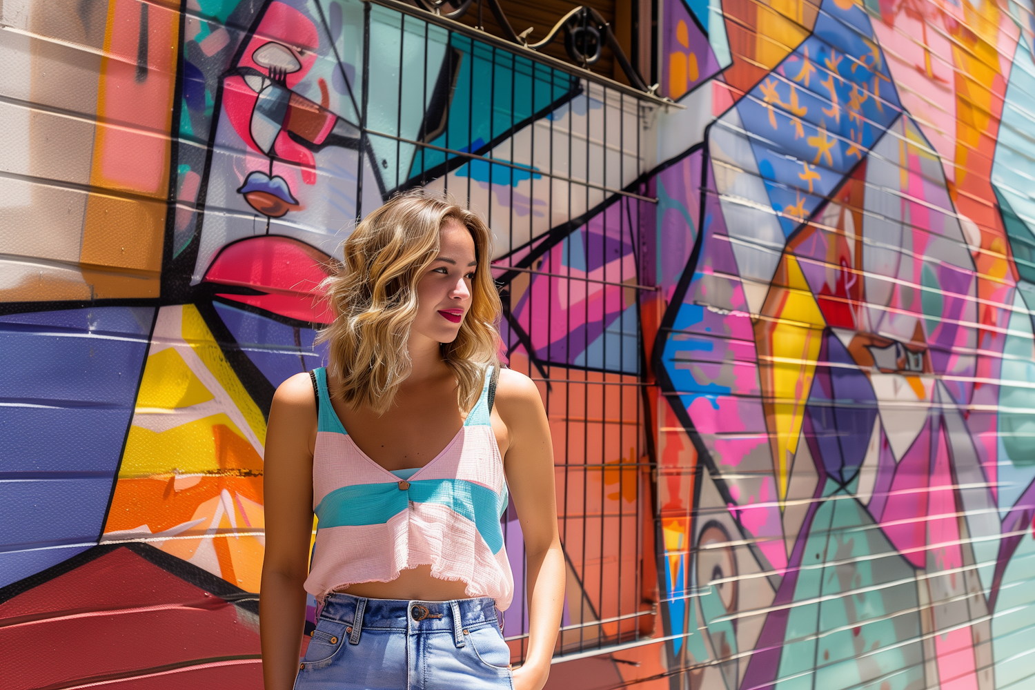 Young woman with blonde hair in front of colorful graffiti wall, wearing a pastel striped top and denim shorts, urban art vibe.