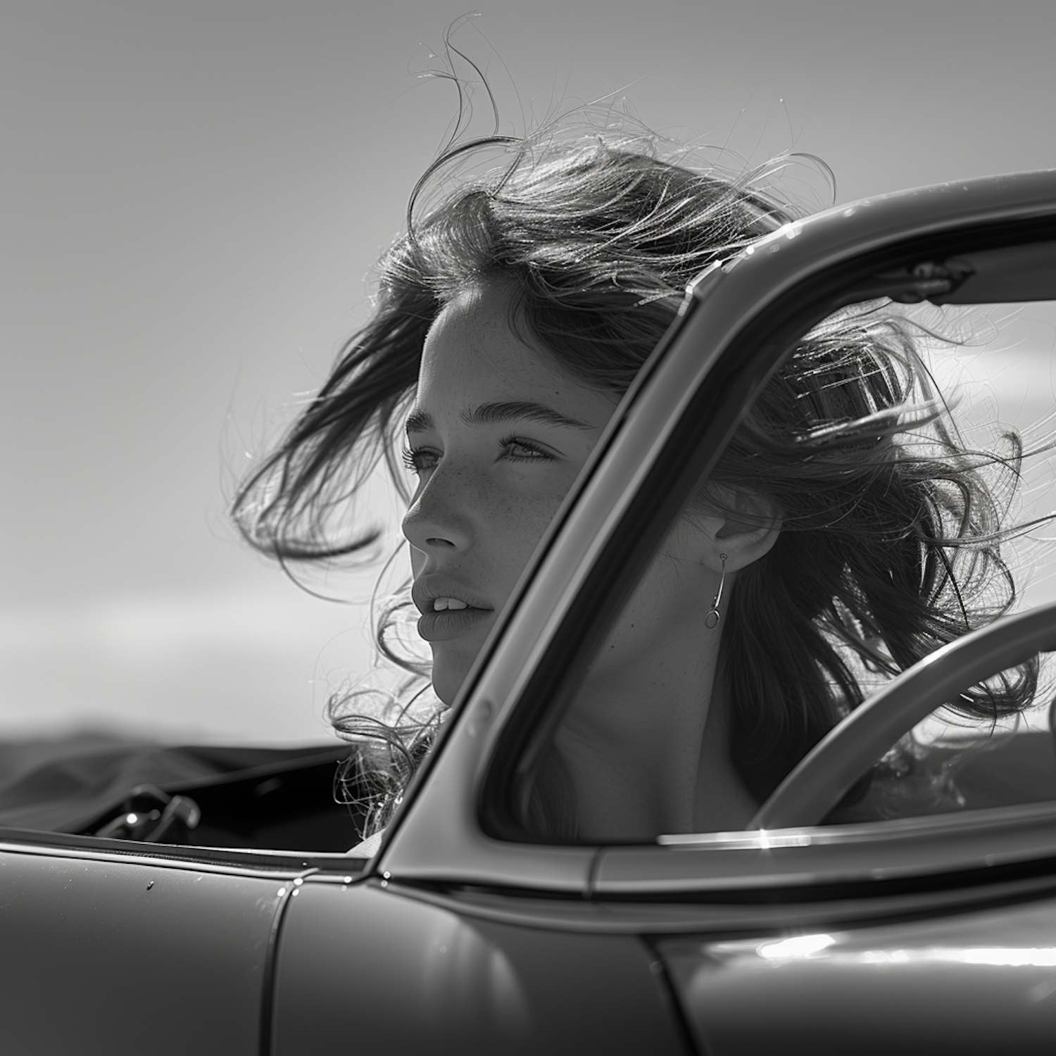 Black and white photo of a woman in a classic car, hair blowing in the wind, with a contemplative expression.