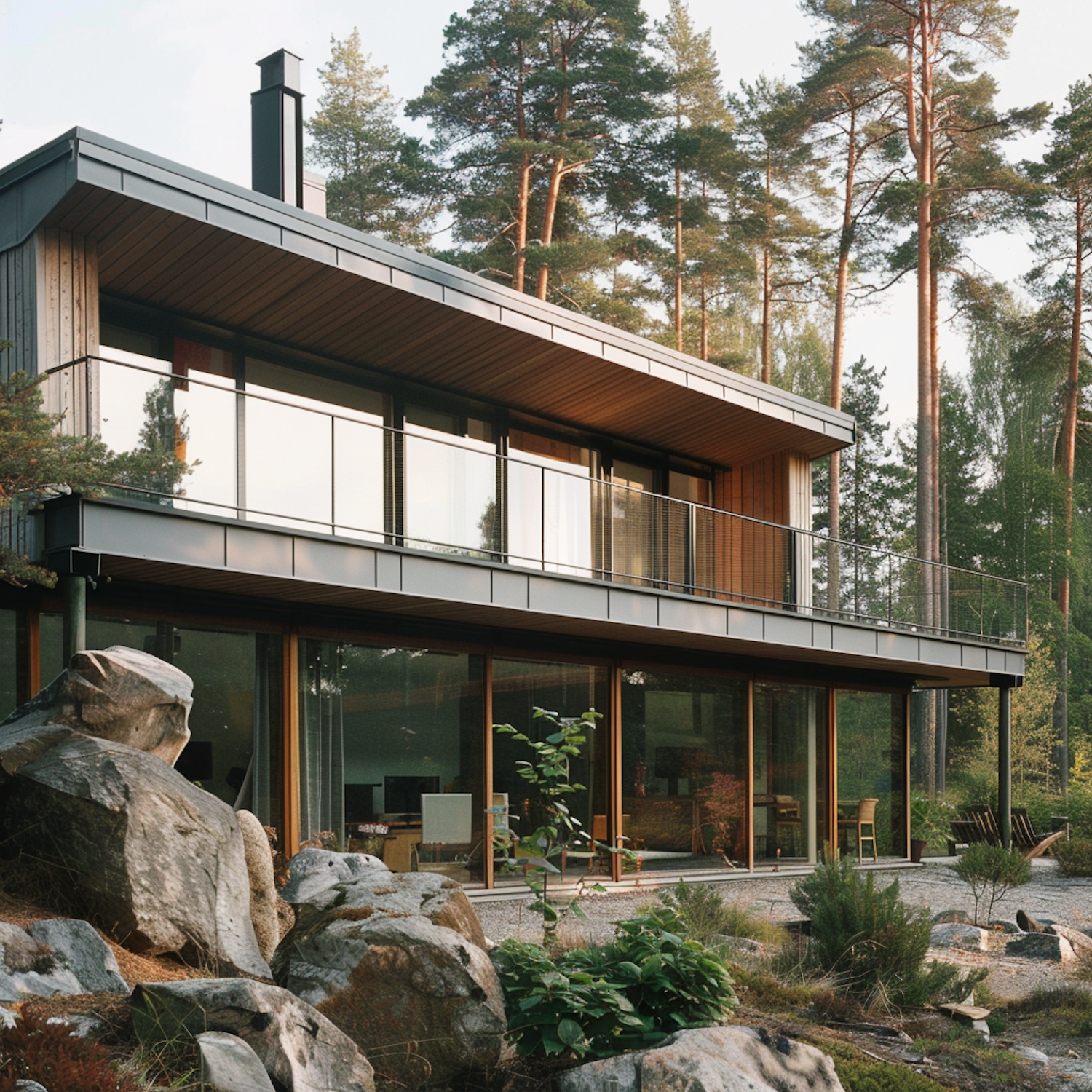 Modern two-story house with large glass windows, nestled in a forest setting with rocks and plants in the foreground.
