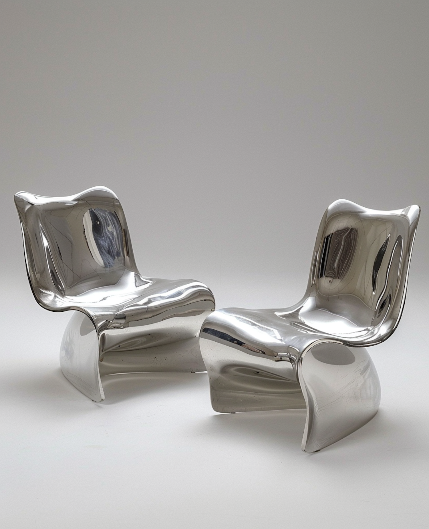 Two futuristic chrome chairs with sleek, reflective surfaces and smooth curves, set against a minimalist background.