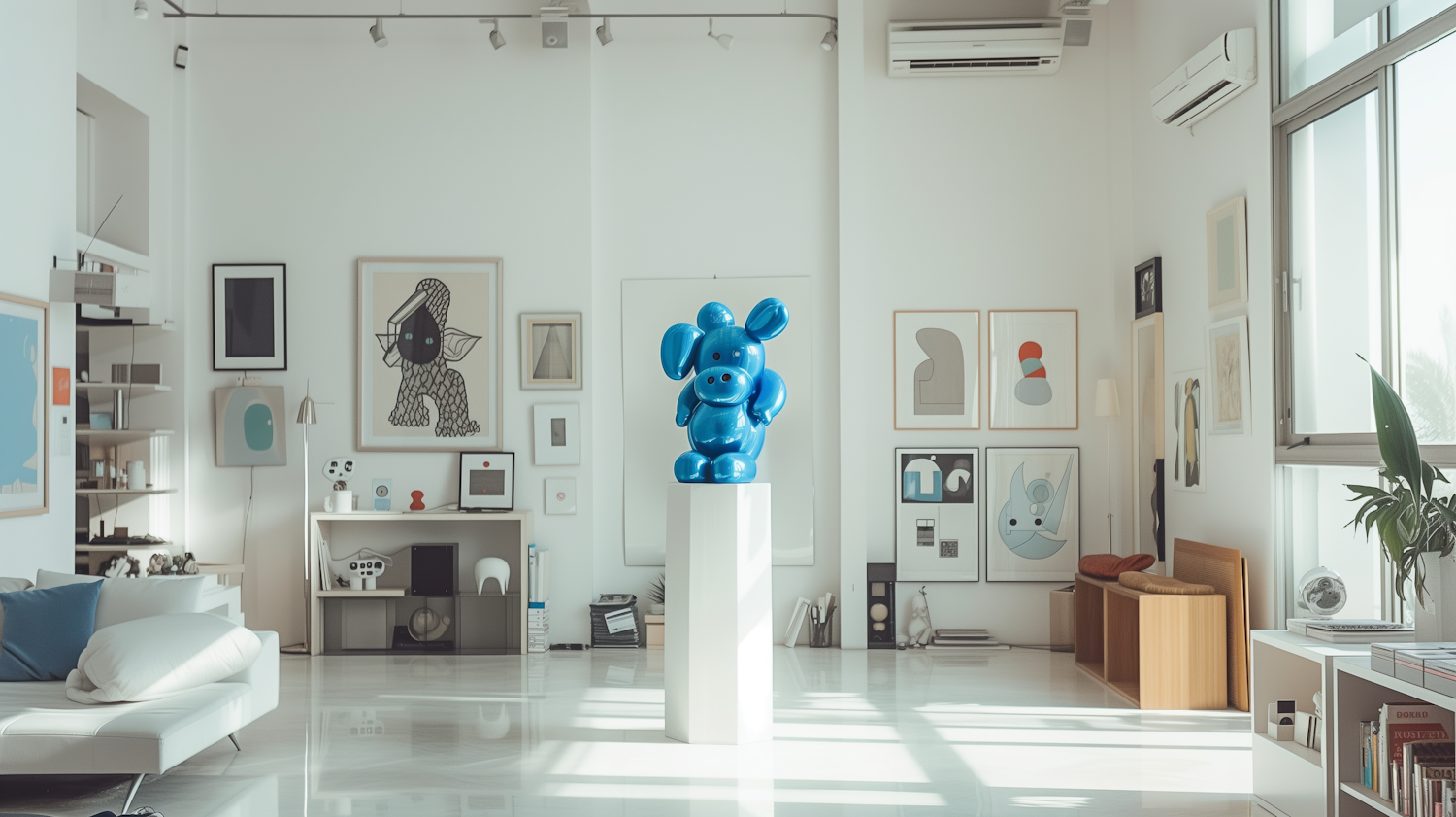 Contemporary Art Gallery Interior with Blue Balloon Dog Sculpture
