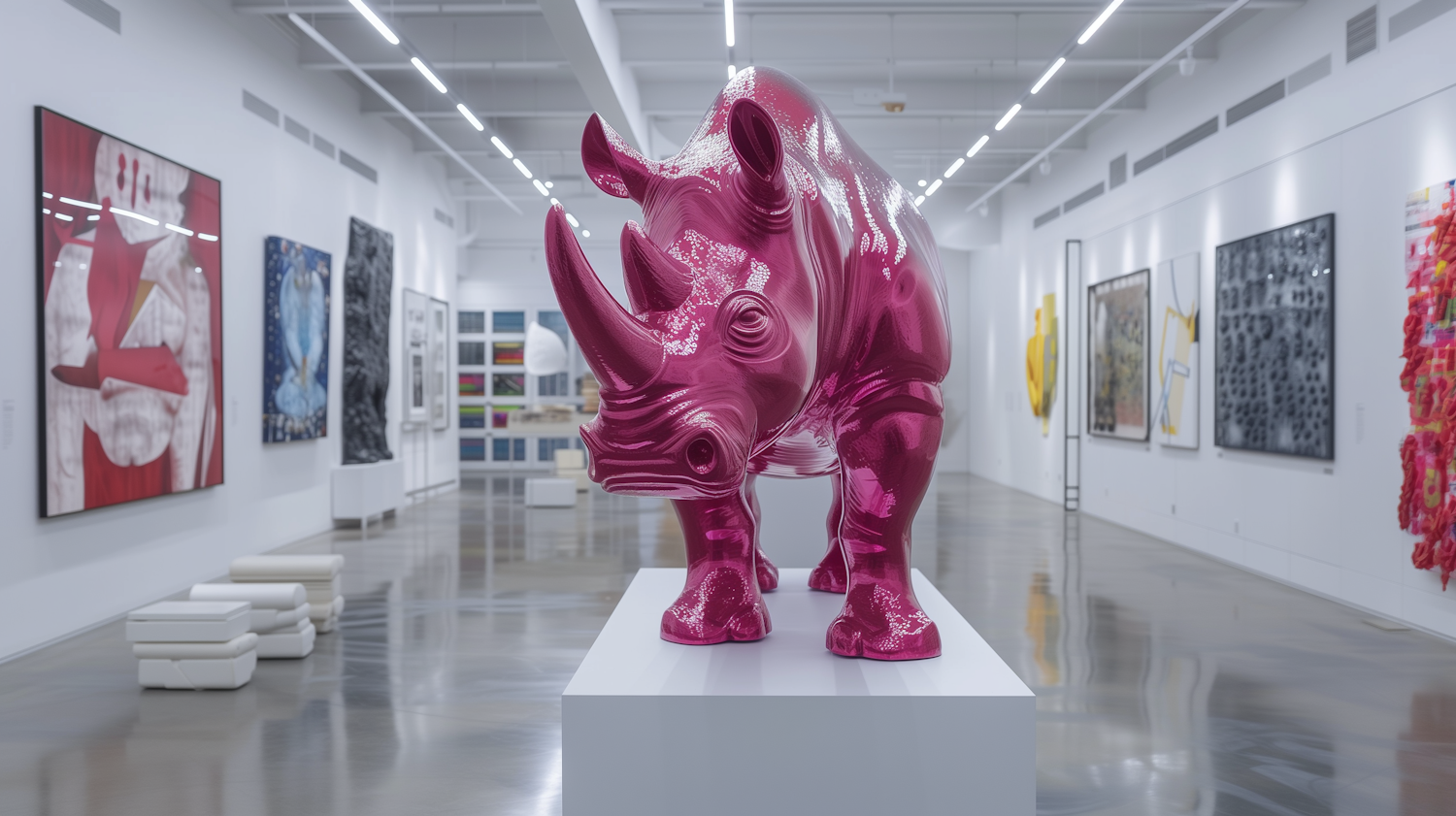 A glossy pink rhinoceros sculpture stands in a modern art gallery, surrounded by abstract paintings and contemporary artworks.