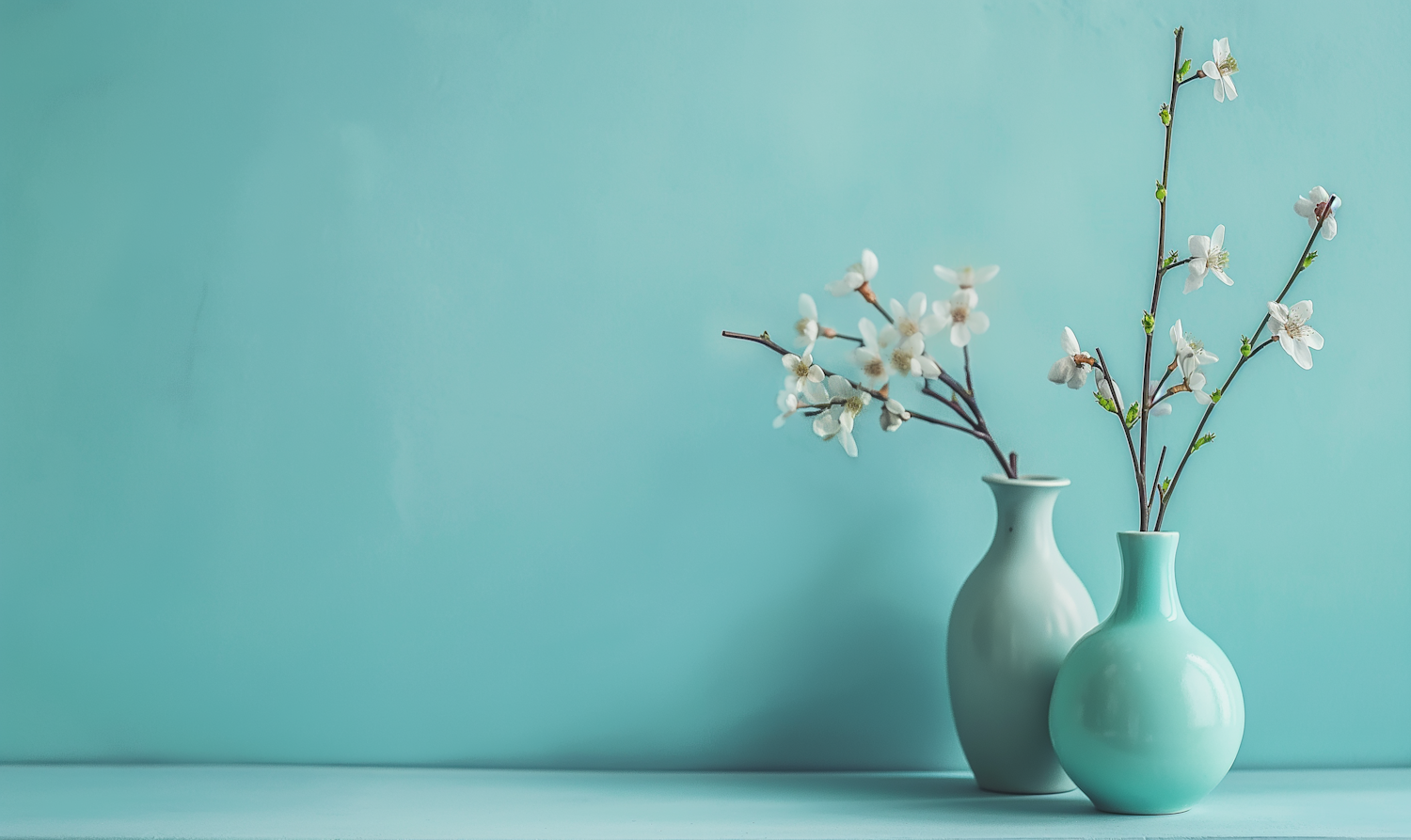 Elegant turquoise vases with white blossoms against a serene background, creating a minimalist and calming aesthetic.
