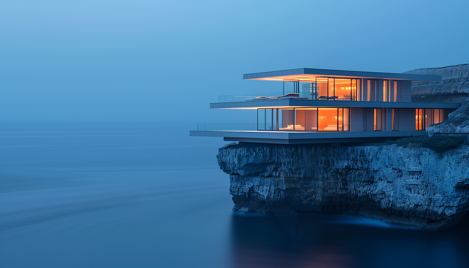 Modern cliffside house with warm lighting, overlooking a serene ocean at dusk. Sleek design contrasts with rugged cliff textures.