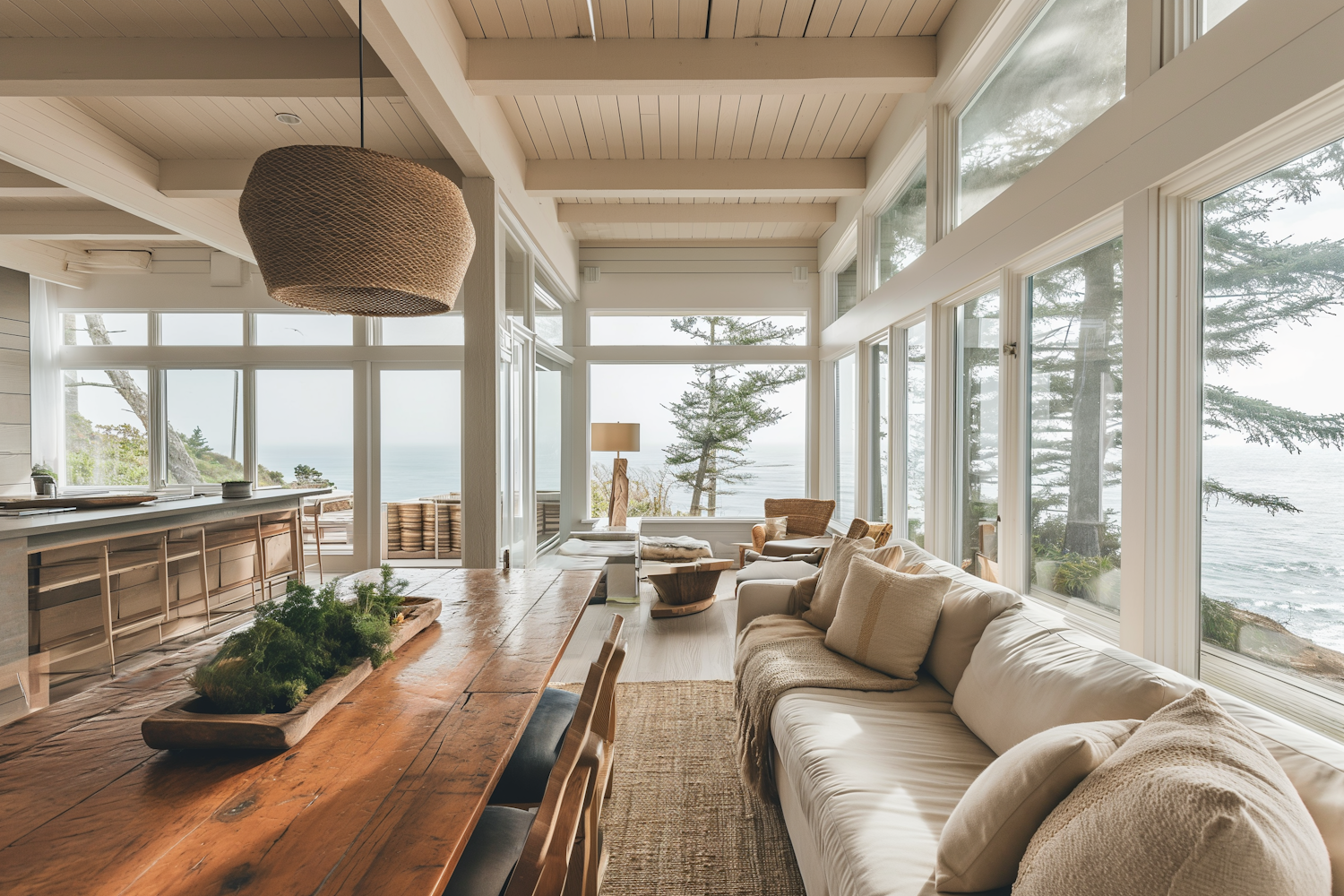 Bright coastal living room with ocean views, large windows, rustic wooden table, beige sofas, and woven pendant light.