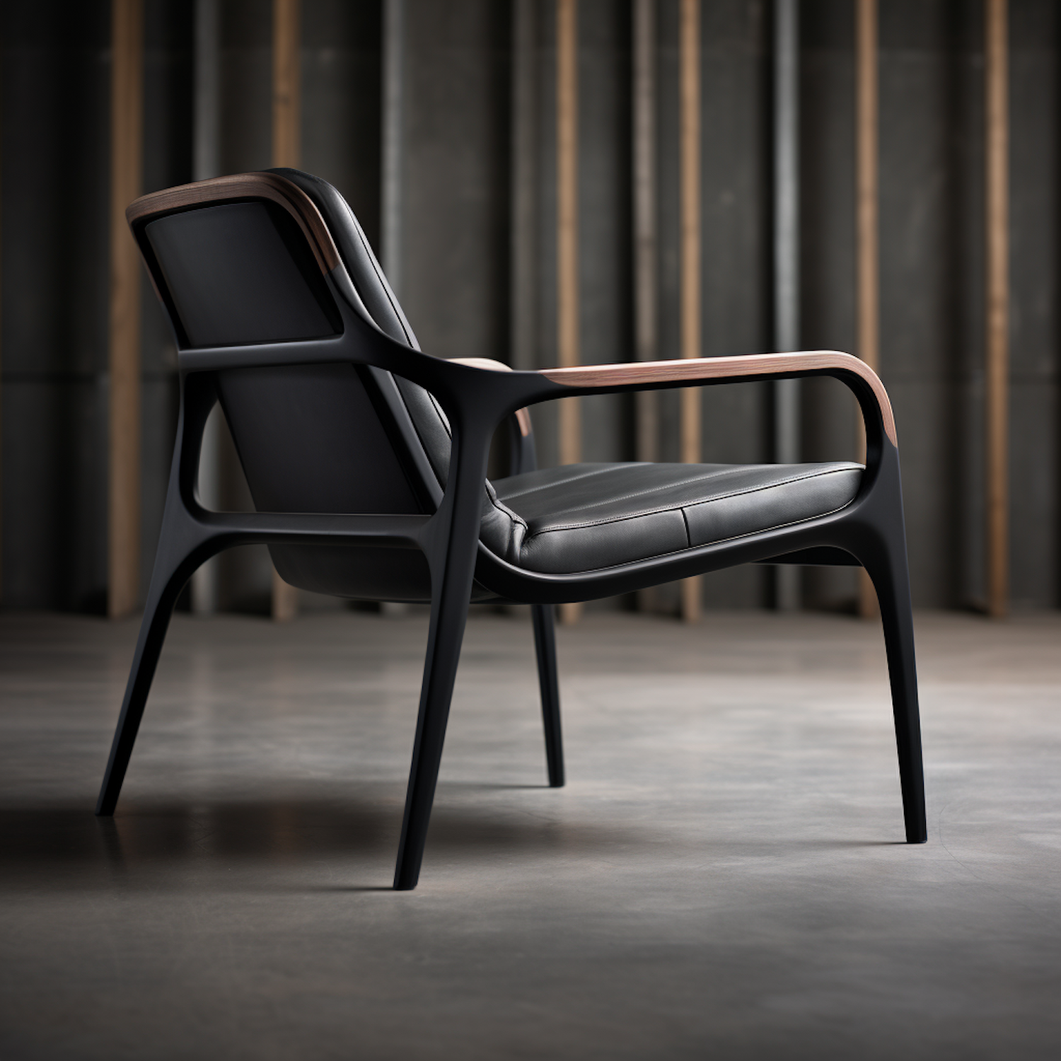 Sleek modern chair with black leather and dark wood frame in a minimalist setting. Elegant design with integrated armrests.