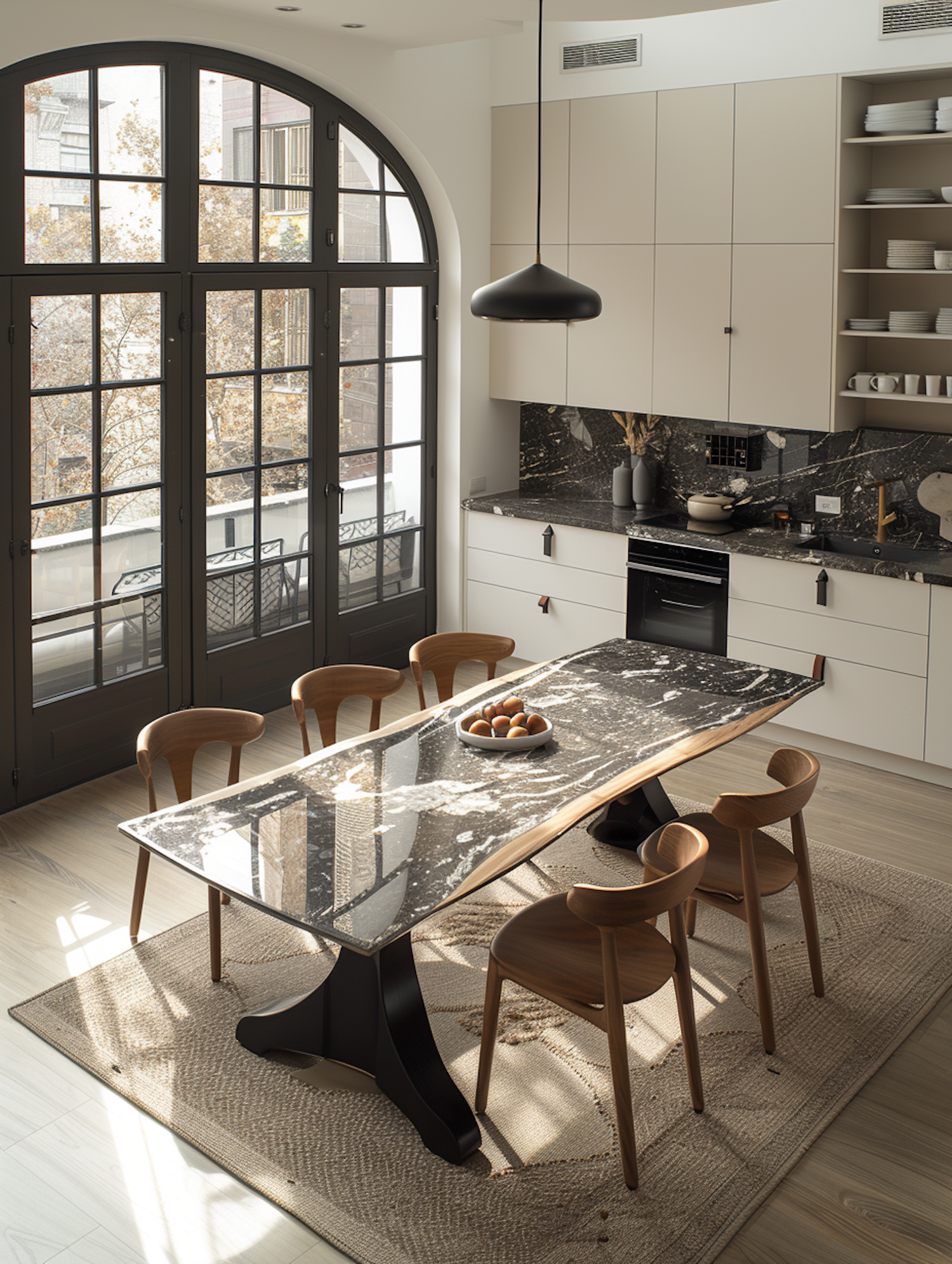 Modern kitchen with black marble table, wooden chairs, and large arched window. Beige cabinets and pendant light complete the elegant look.