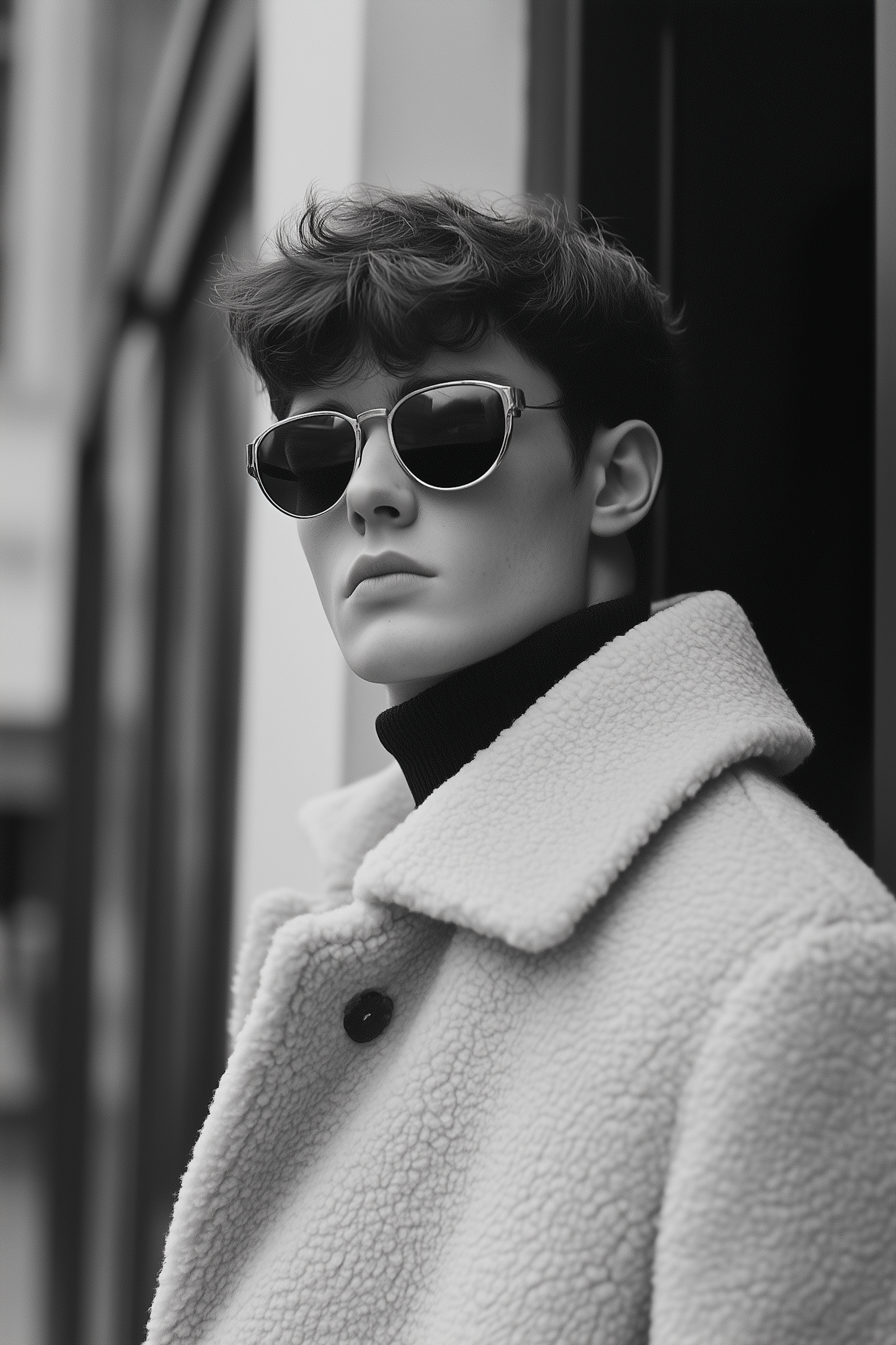 Stylish black-and-white portrait of a young individual in sunglasses, a shearling coat, and a turtleneck, exuding confidence.
