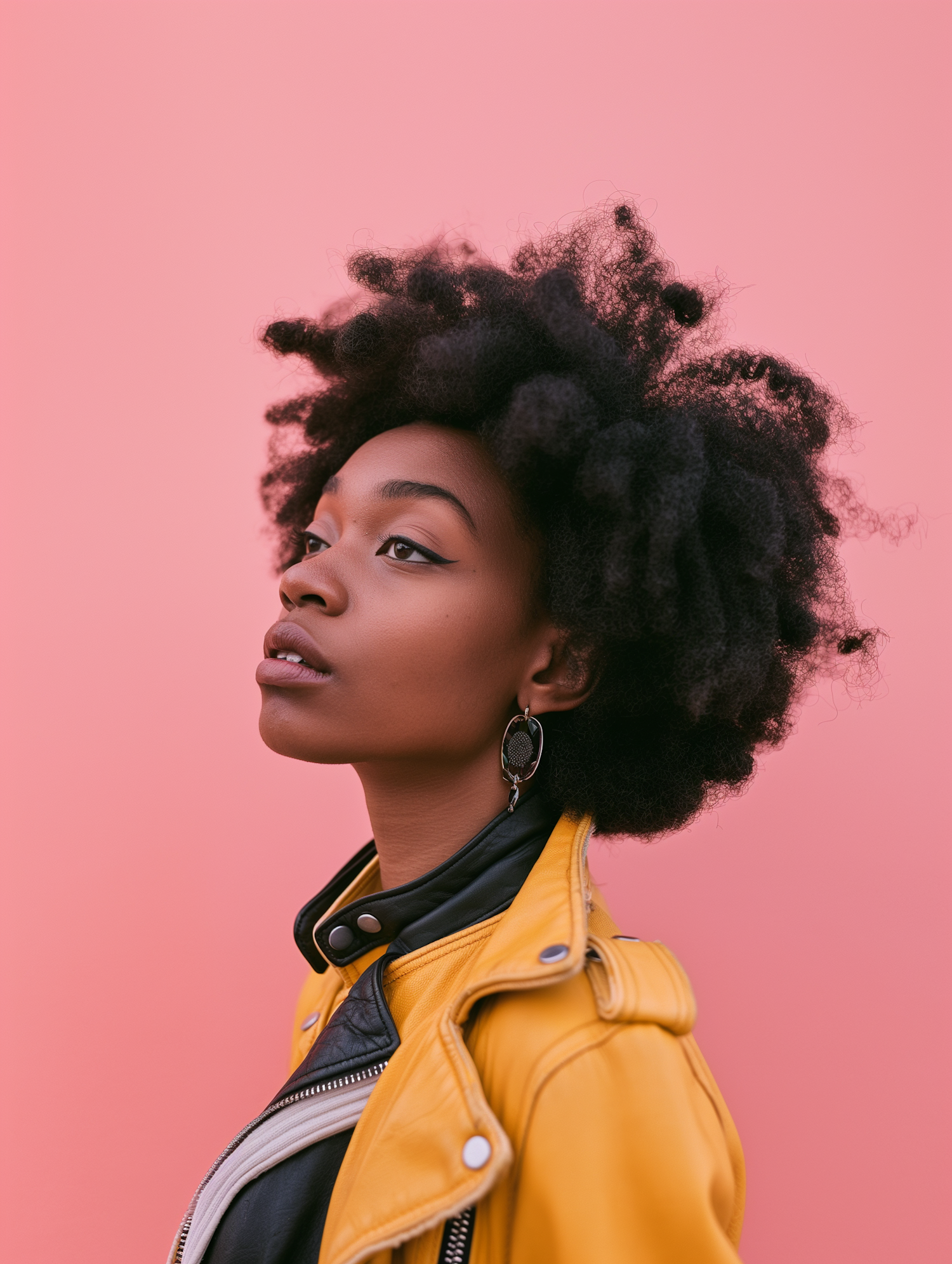 Stylish portrait of a woman with a natural afro, yellow leather jacket, and bold eyeliner against a pink background.