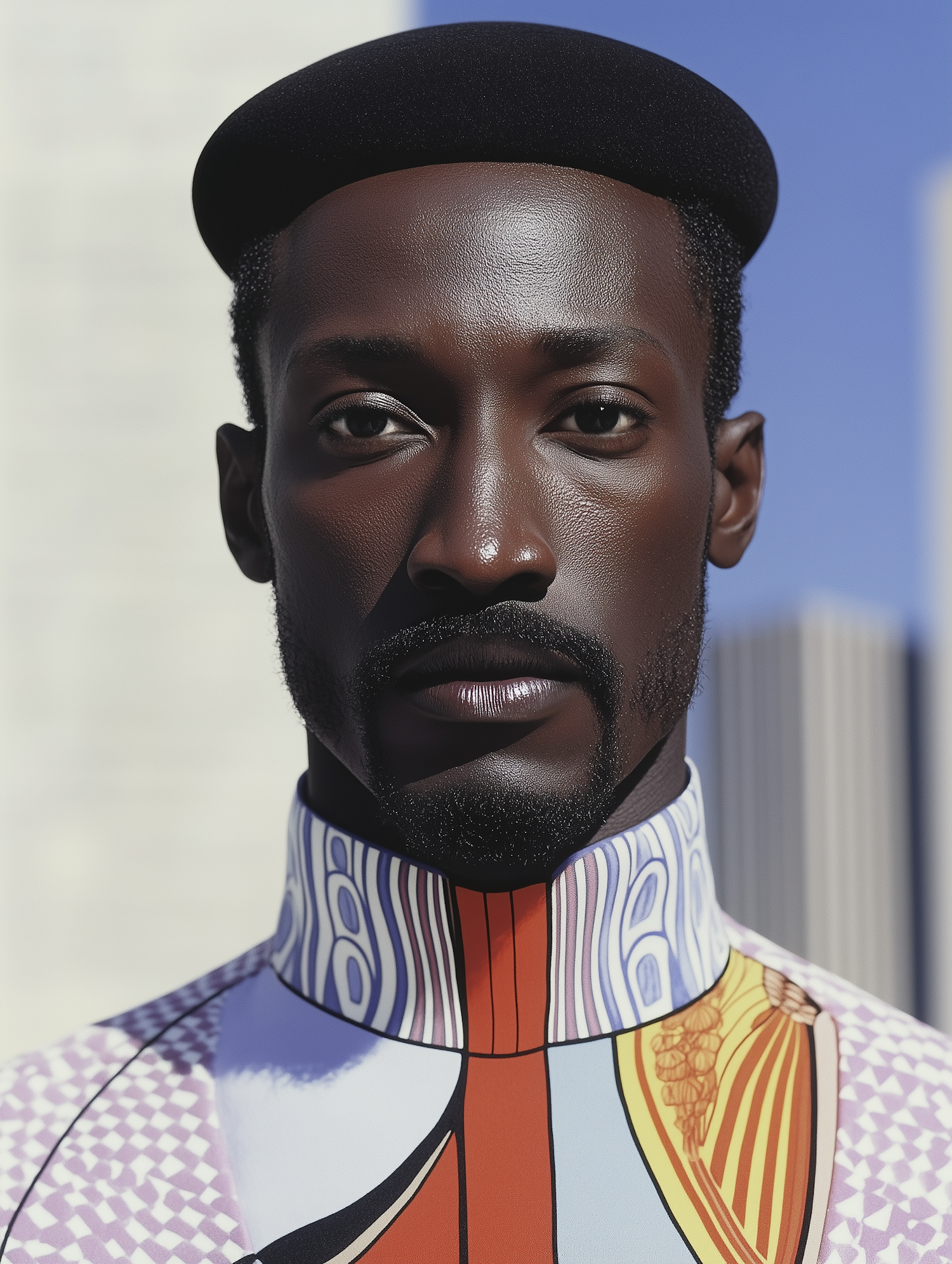 Portrait of a stylish Black man in a vibrant patterned outfit and sleek hat, set against a blurred urban background.