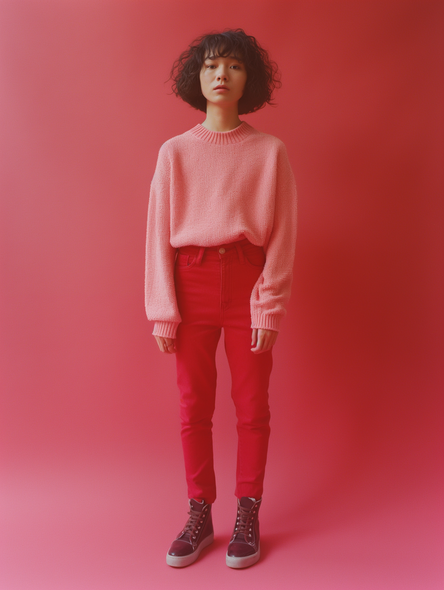 Asian individual in pink sweater and red pants against a red background, with curly hair and dark red sneakers.