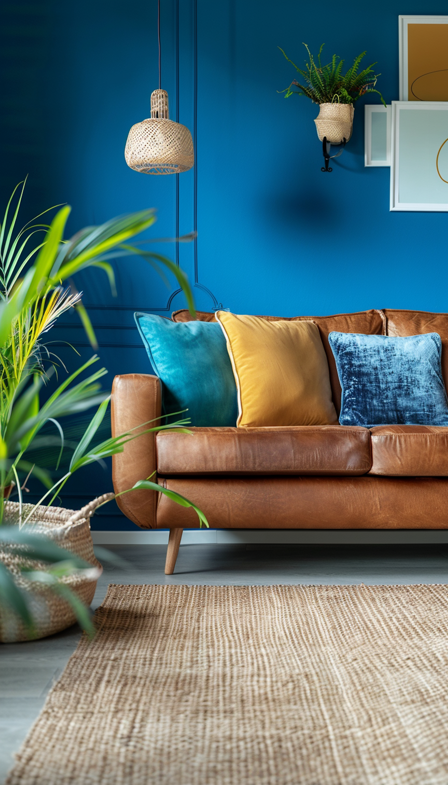 Modern living room with a tan leather sofa, colorful pillows, blue wall, and natural decor elements like plants and woven textures.