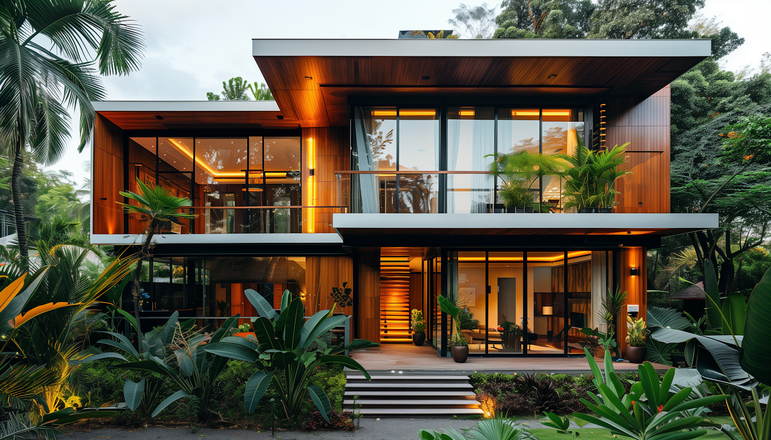 Modern two-story house with glass and wood design, surrounded by lush tropical plants and ambient lighting, creating a serene atmosphere.