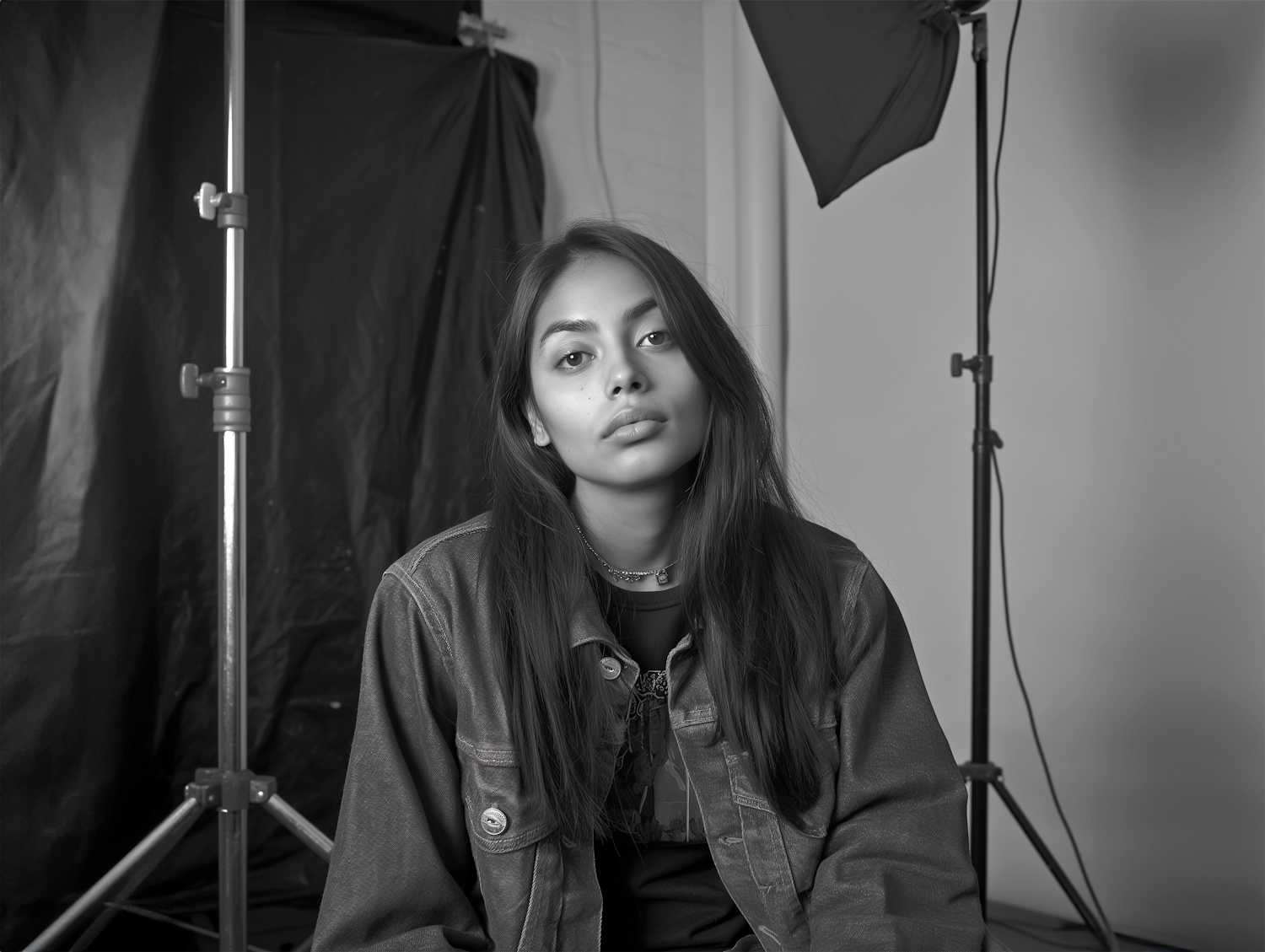 Black and white portrait of a young woman in a denim jacket, sitting in a photography studio with a neutral expression.