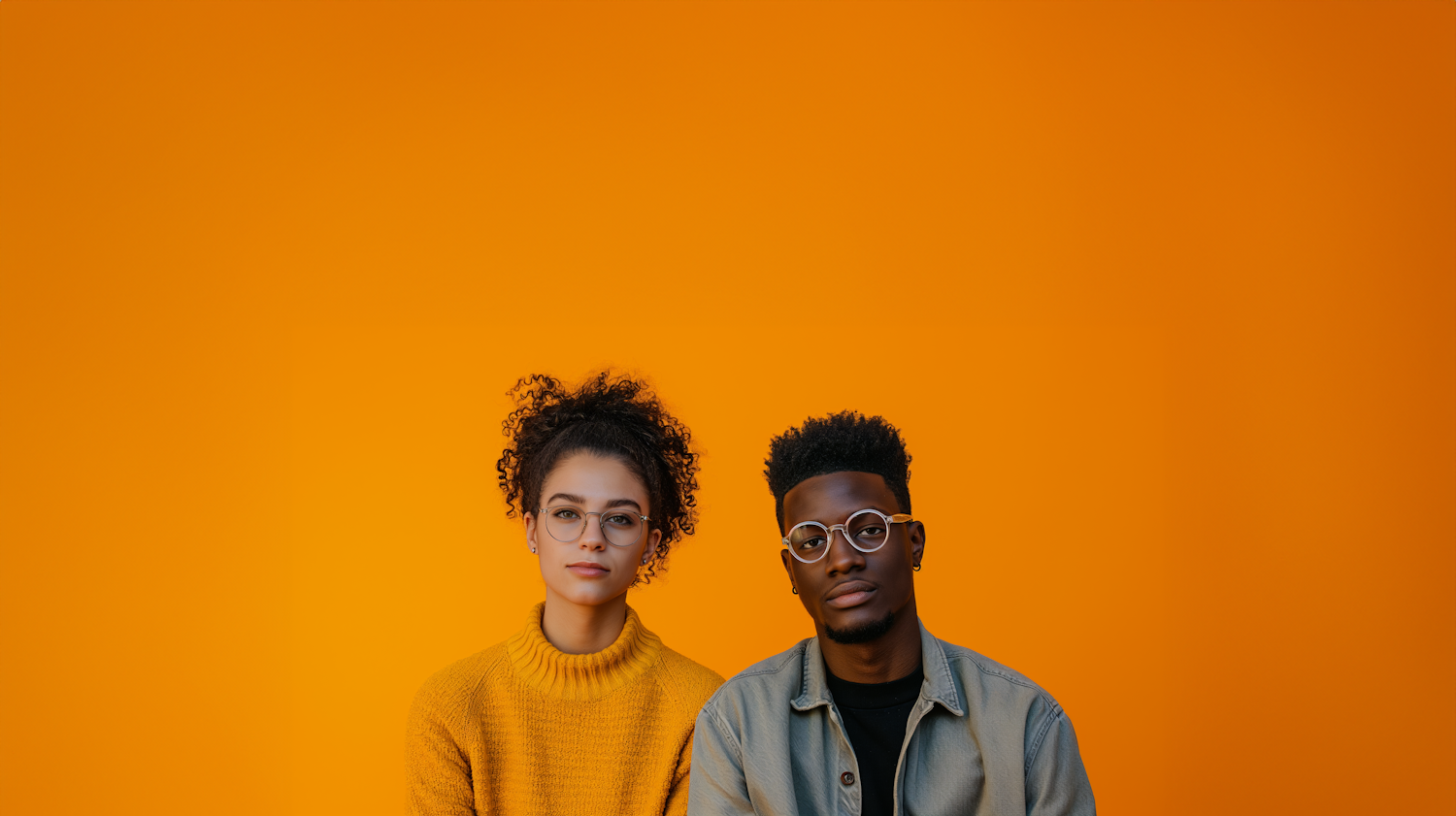 Two stylish individuals with glasses pose against a vibrant orange background, showcasing modern fashion and a sense of connection.