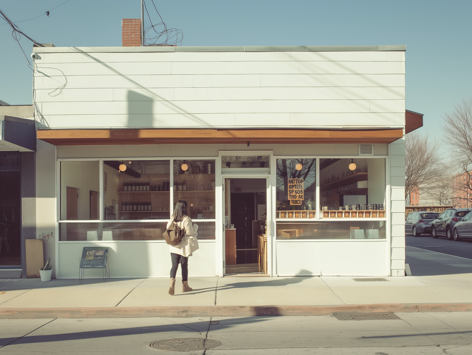 Modern white storefront with large windows, wooden trim, and a woman walking towards the entrance on a sunny day.