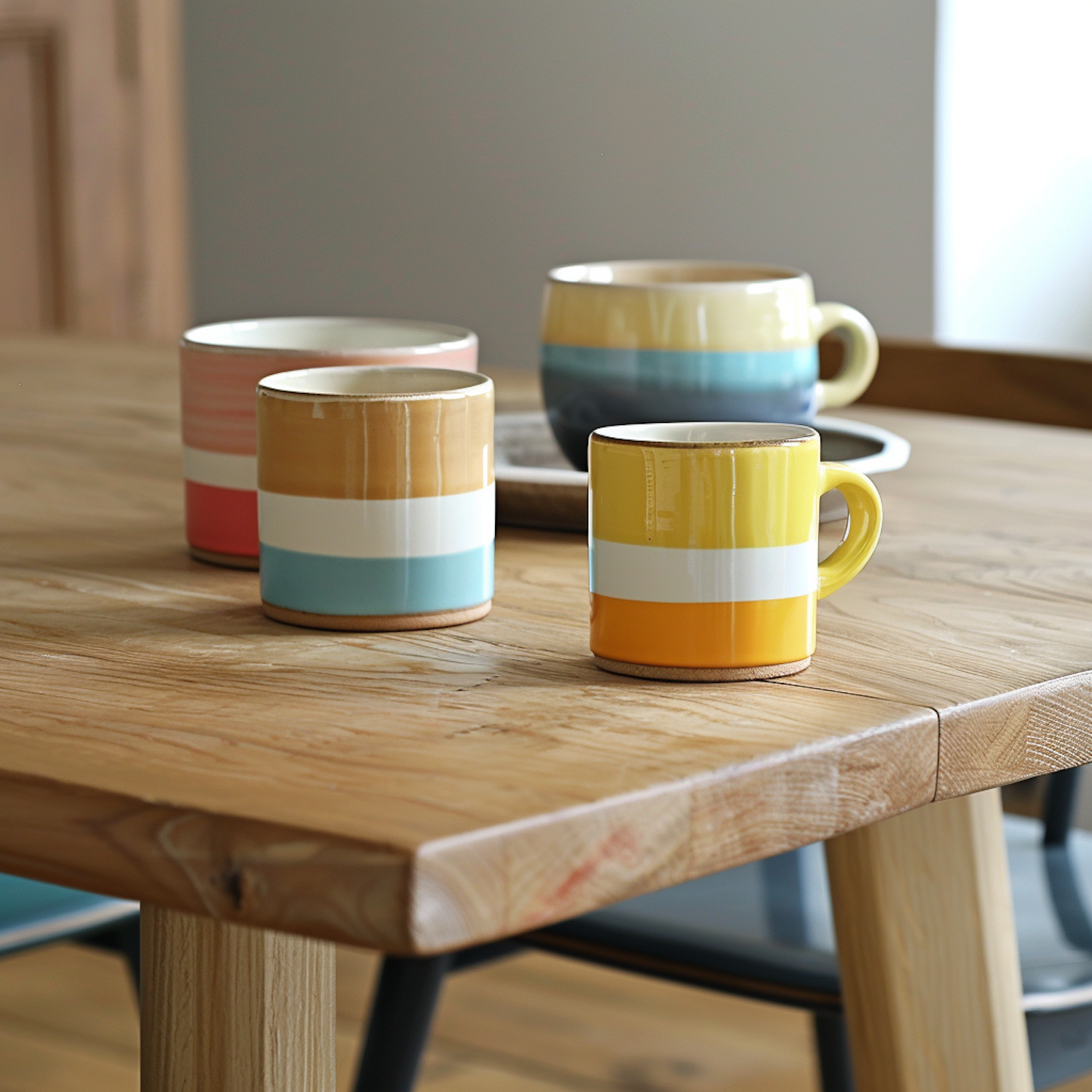 Colorful striped ceramic mugs on a wooden table, featuring vibrant hues and a cozy, inviting atmosphere.