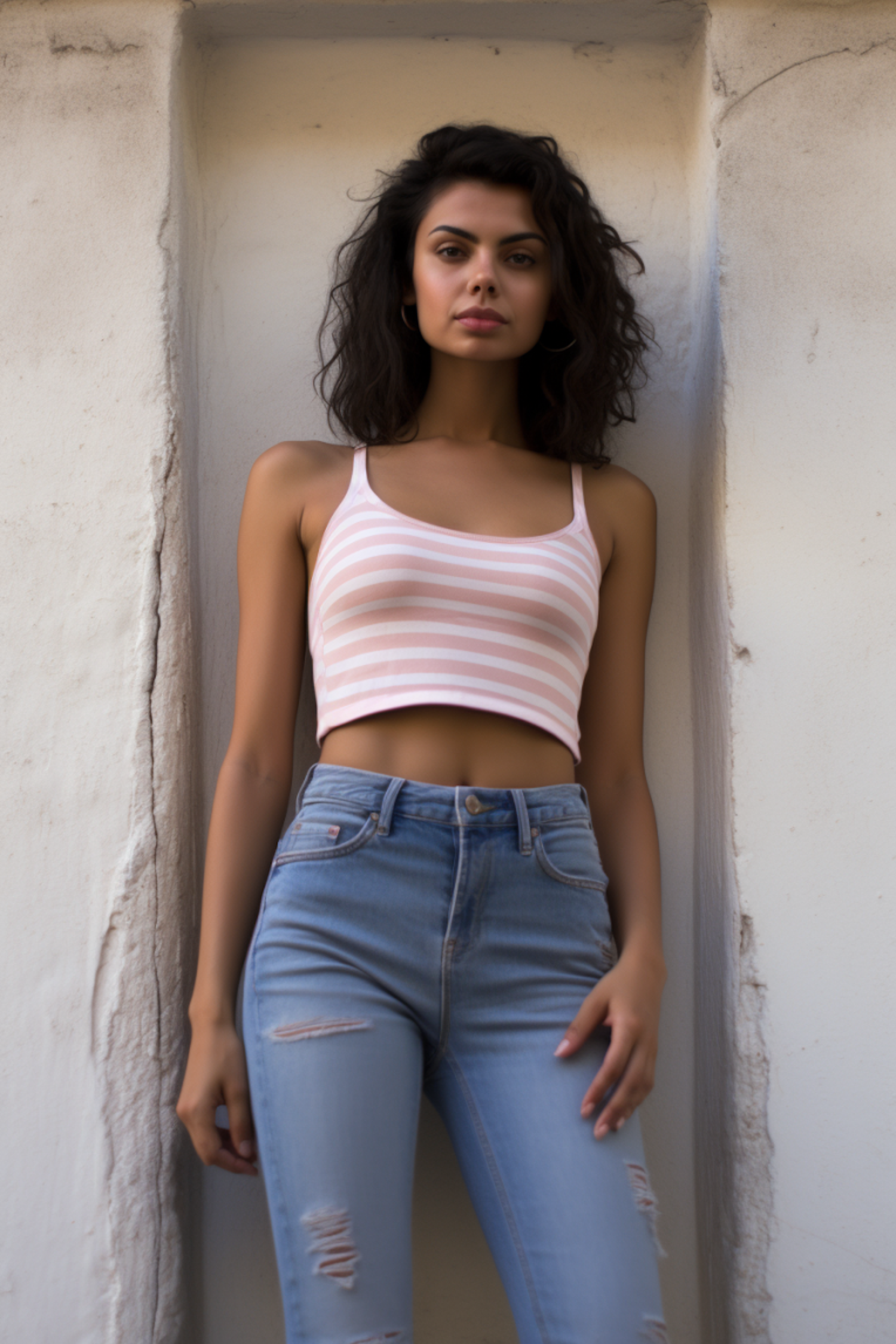 Stylish woman in pink striped crop top and ripped jeans poses confidently against a textured wall, exuding casual elegance.