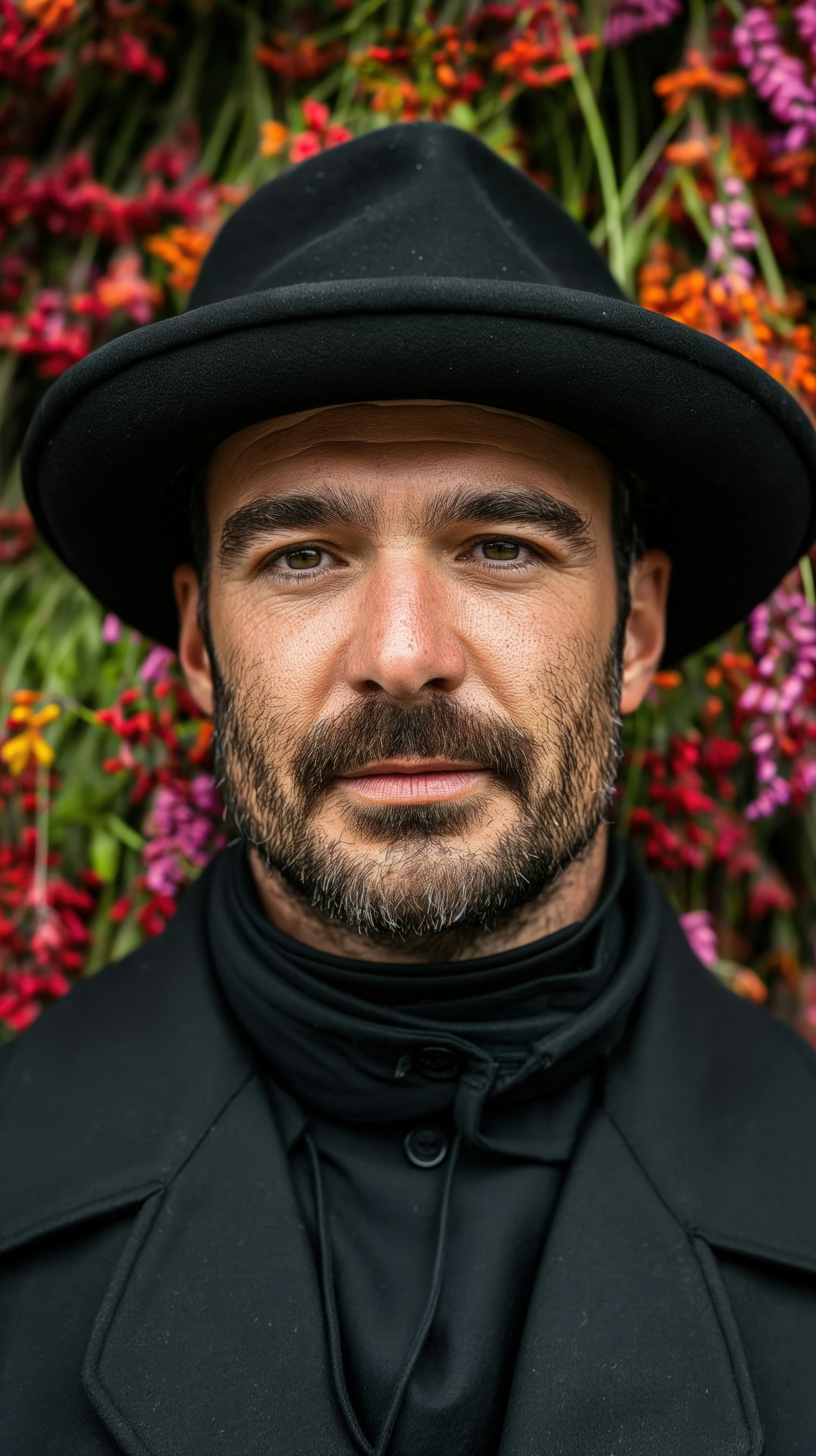 Portrait of a bearded man in a black hat and coat, set against a vibrant floral background with red, orange, and pink flowers.