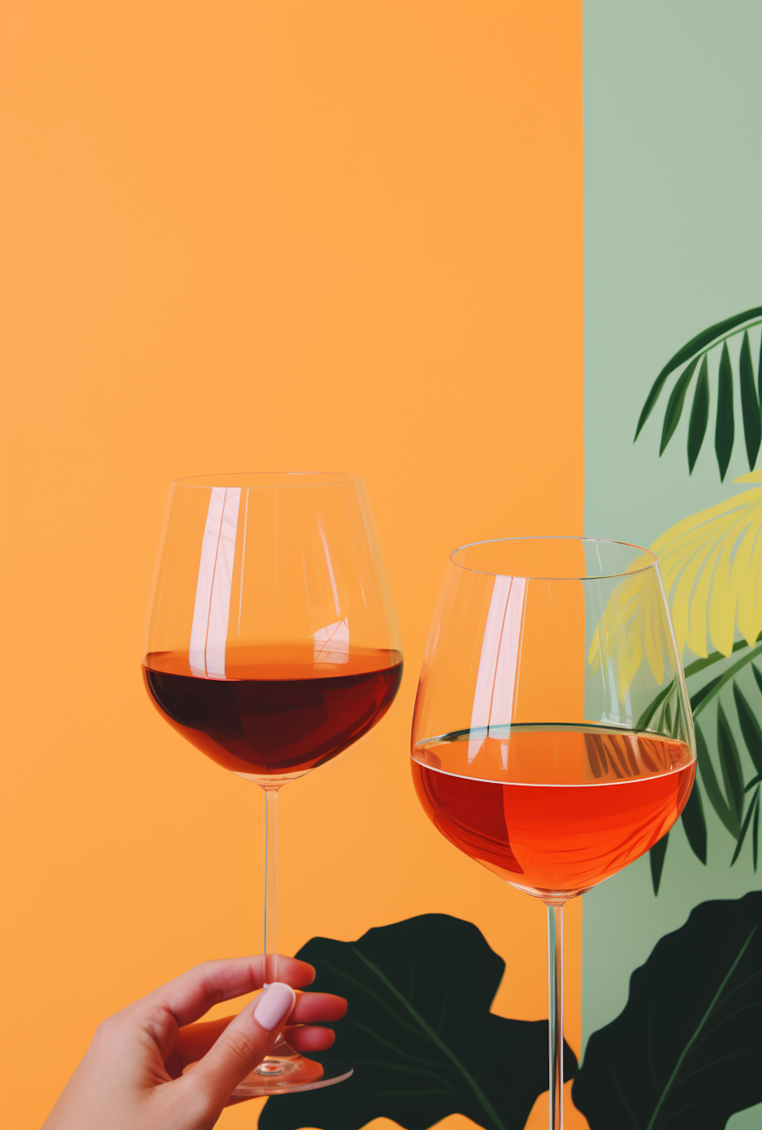 Two wine glasses with red and rosé wine against a vibrant orange and green background with tropical leaves.