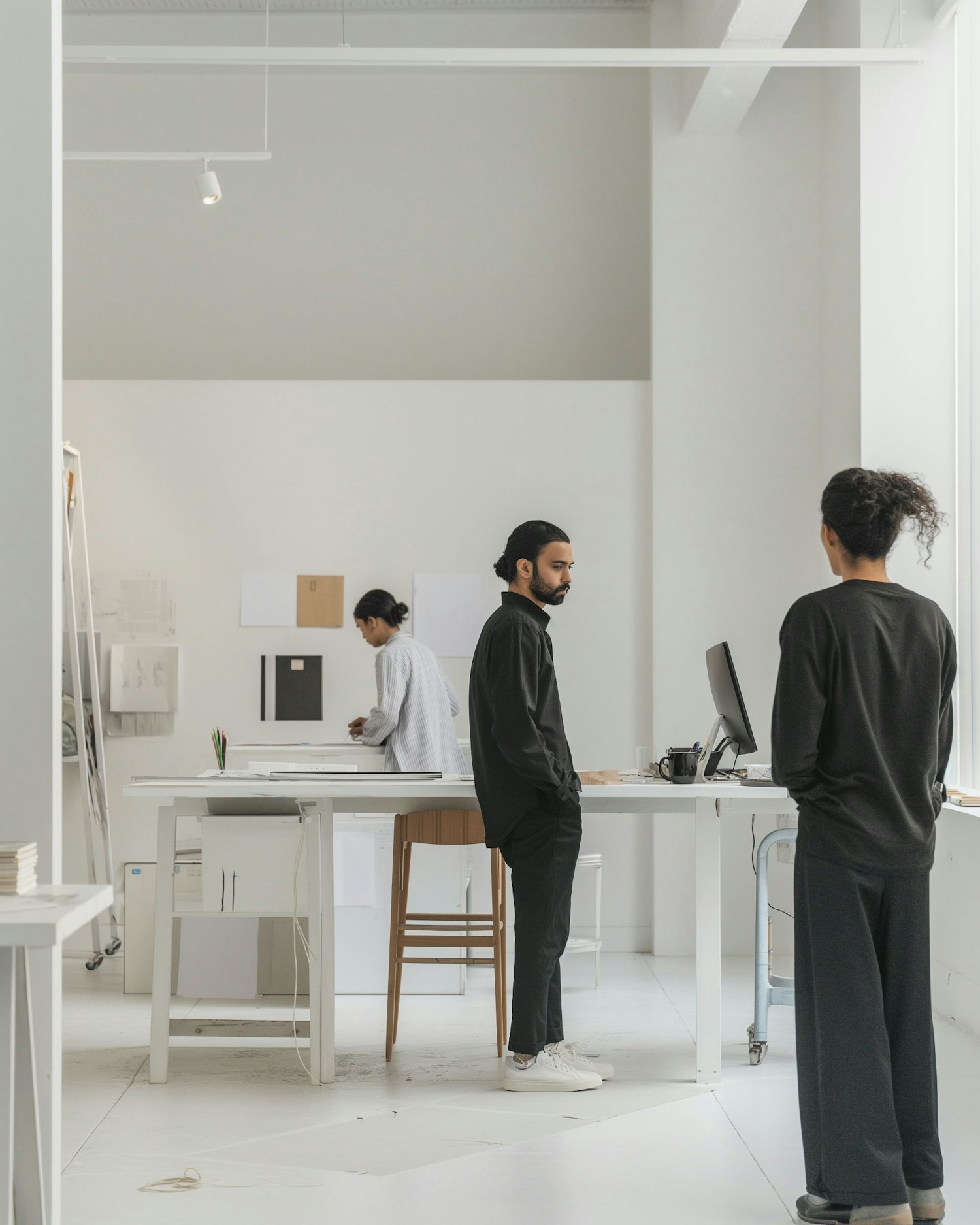 Modern office with three people working in a minimalist, bright space. Clean design and focused atmosphere.