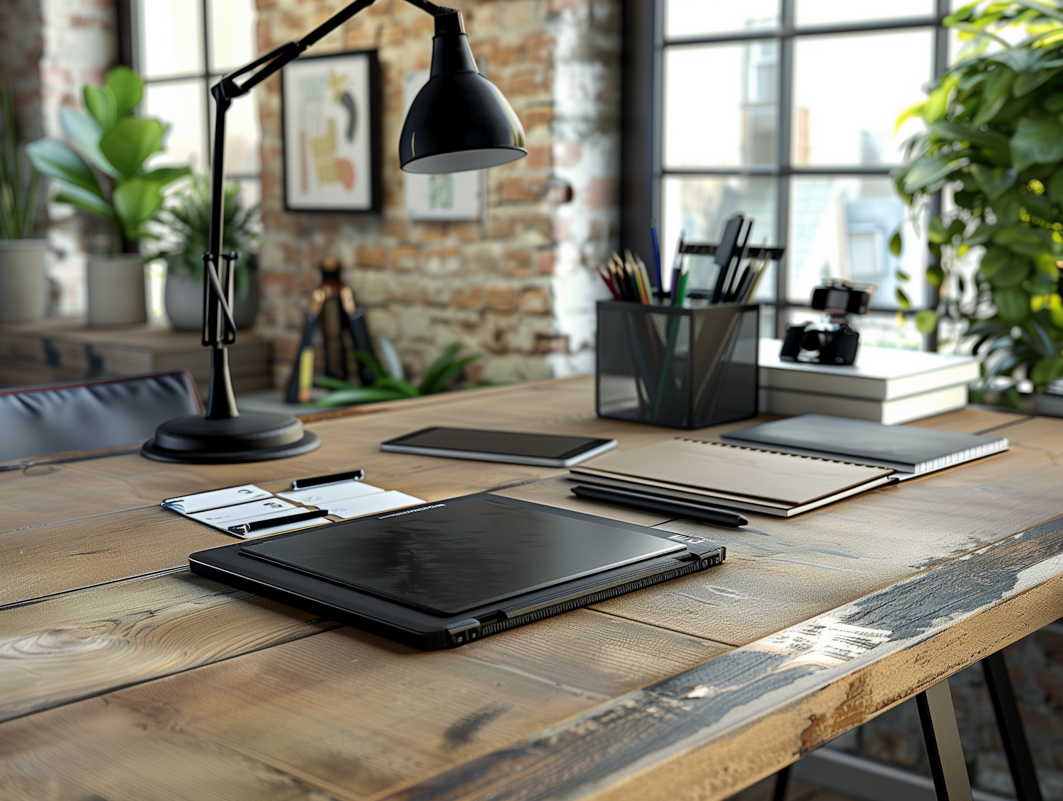 Modern workspace with rustic table, laptop, tablet, and desk lamp. Brick wall and large windows create an industrial yet cozy vibe.