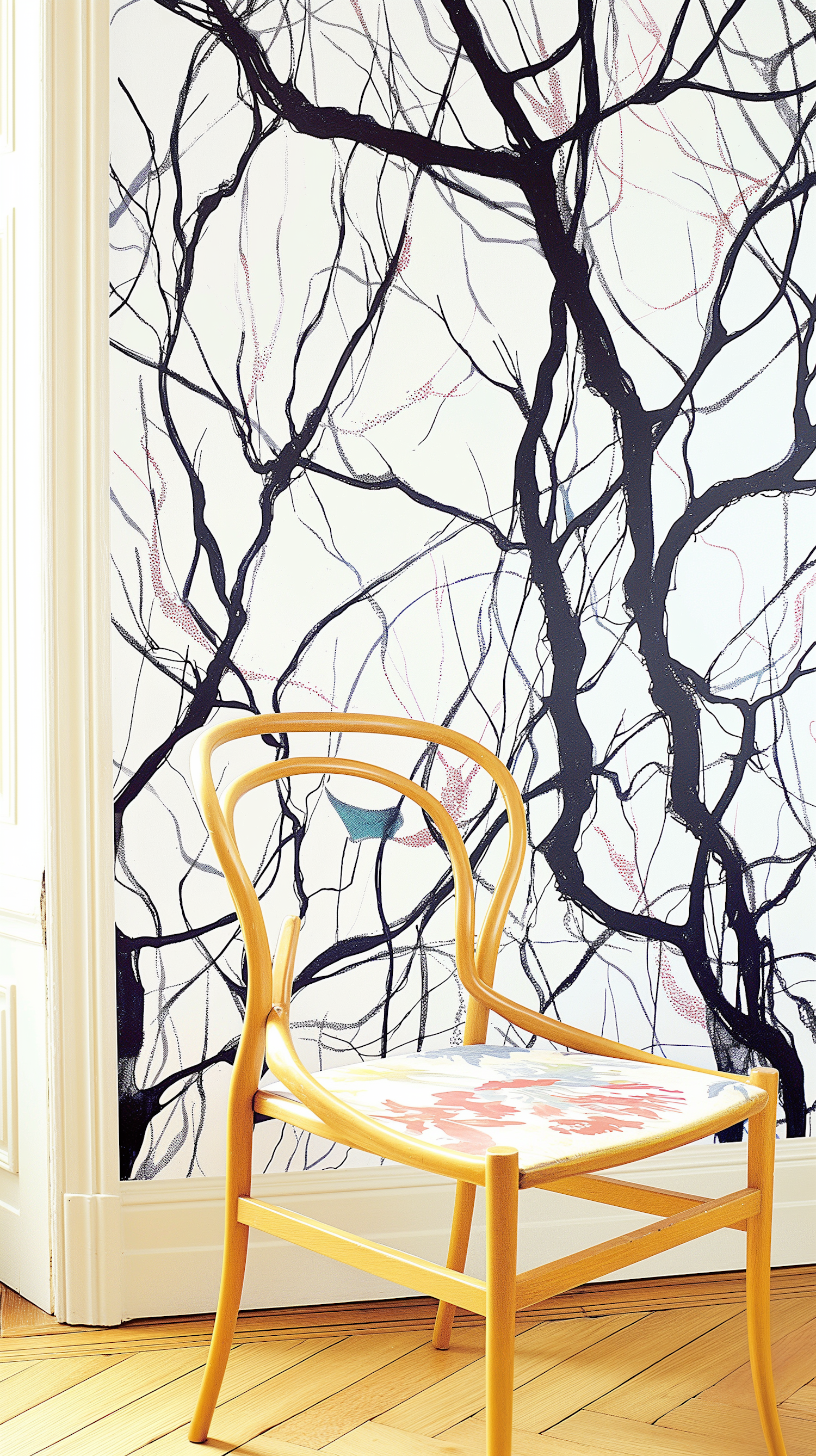 Wooden chair with floral seat against a bold black branch-patterned wallpaper, creating a modern artistic interior.