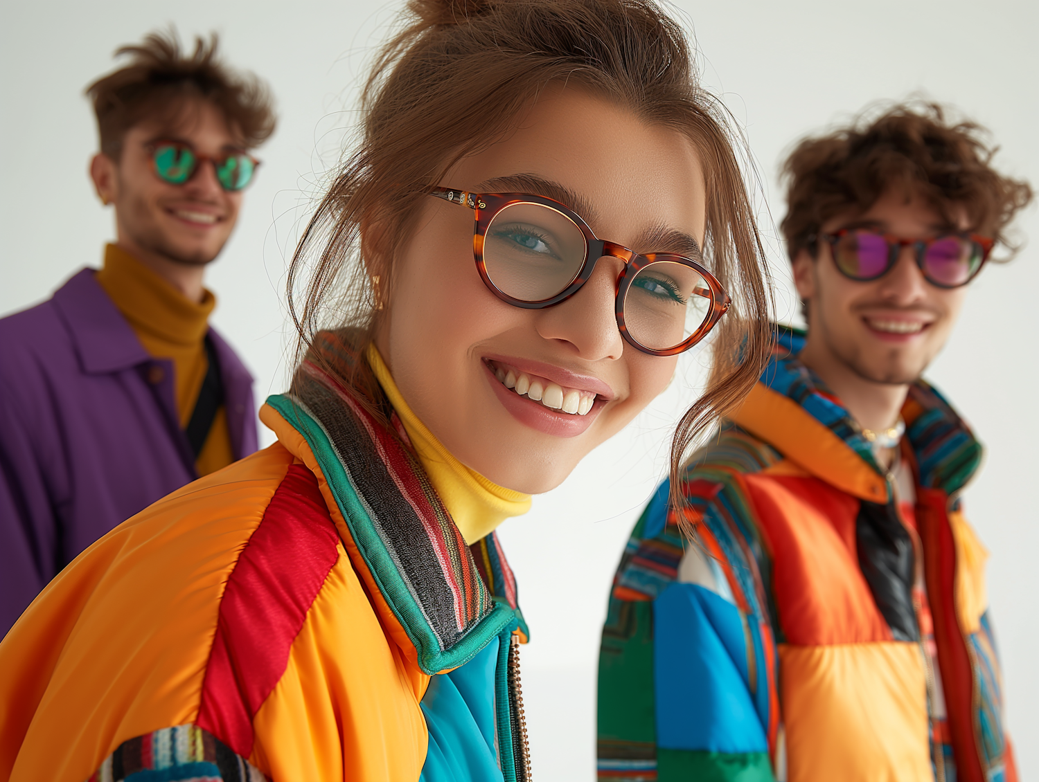 Three young adults in colorful jackets and glasses, smiling joyfully. Trendy fashion and vibrant colors create a lively scene.