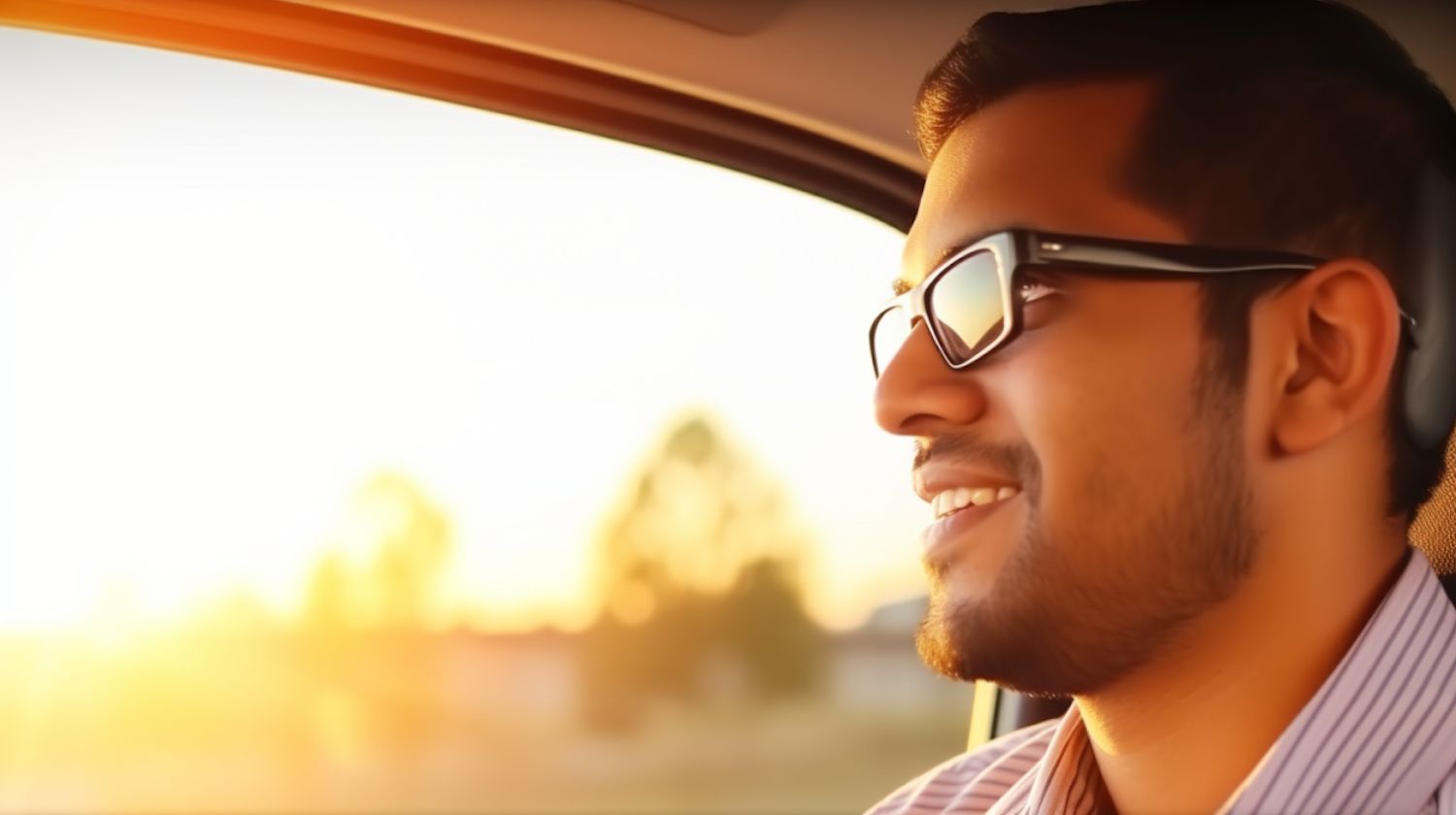 Man with sunglasses smiling in a car, bathed in warm sunlight, wearing a striped shirt. Relaxed and content expression.