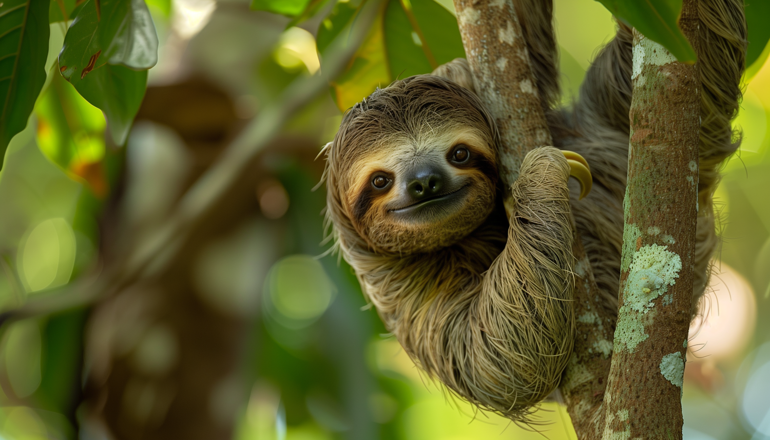 A sloth hangs contentedly from a tree branch, surrounded by lush green leaves and dappled sunlight in a serene forest setting.